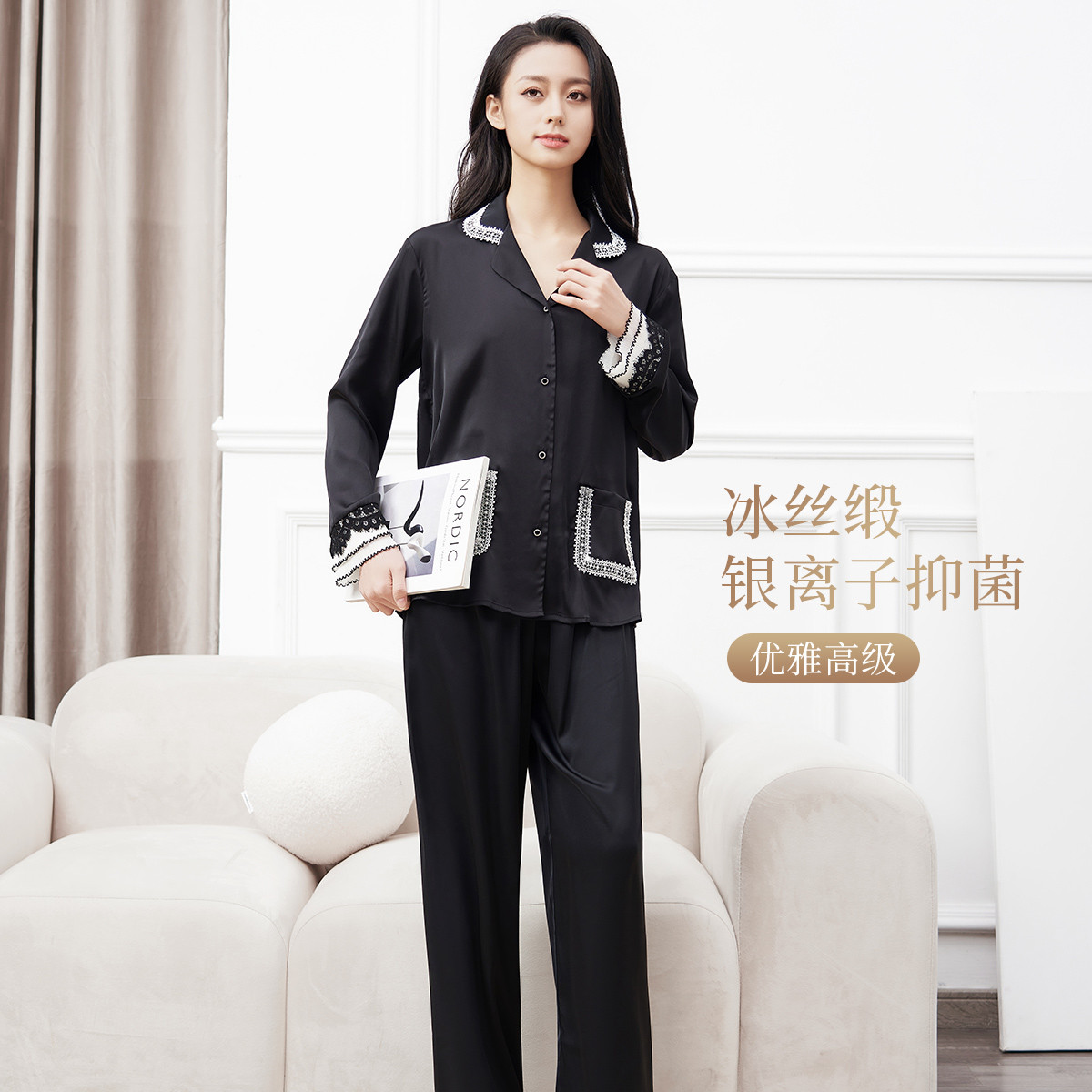 【冰丝缎】高级感丝滑家居服女士春夏款优雅蕾丝翻领开衫睡衣套装 298443