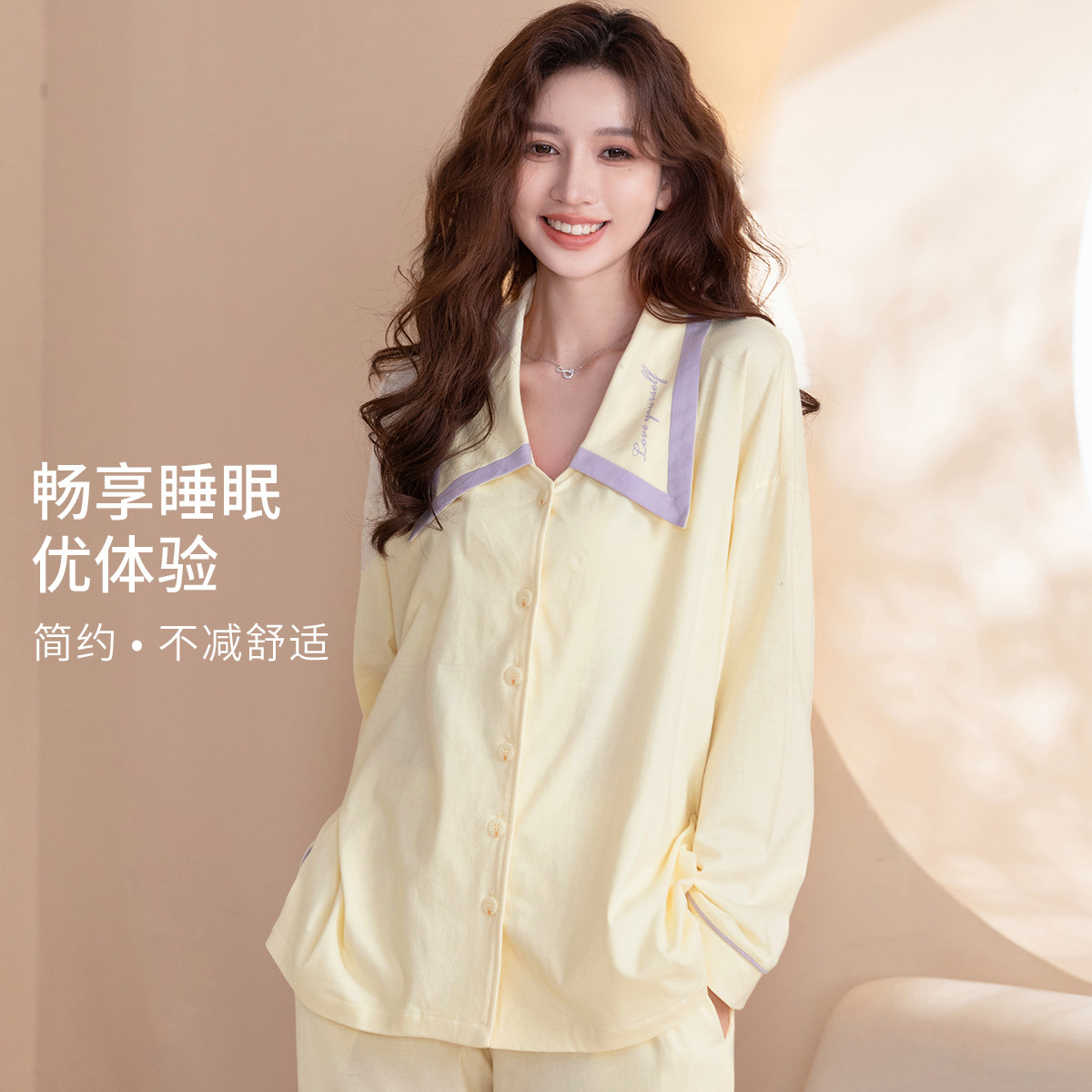 【100%棉】纯棉睡衣女士春秋款舒适翻领开衫家居服套装可外穿 142987