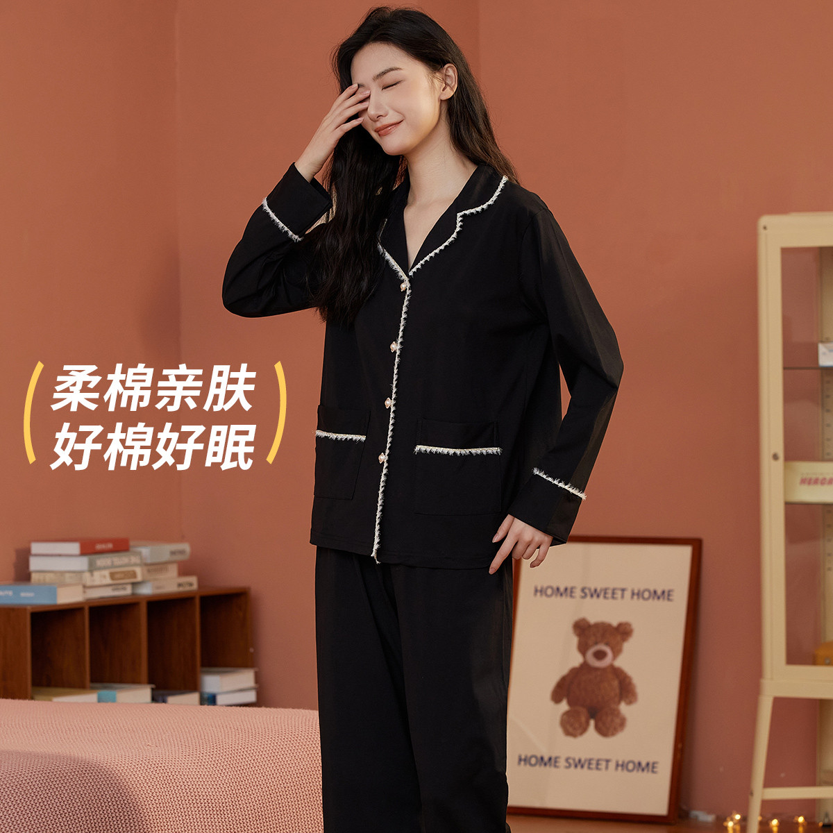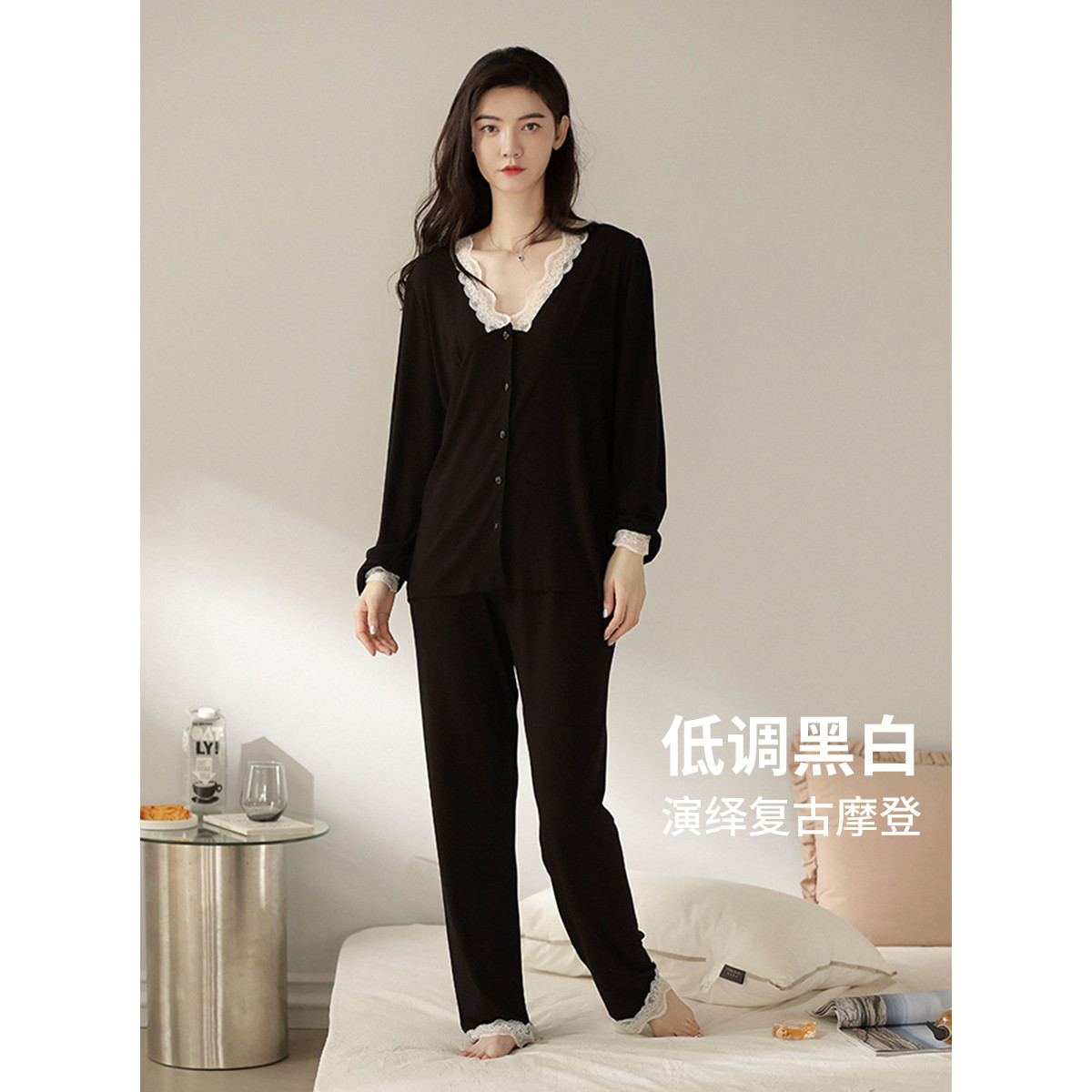 【可盐可甜】蕾丝v领睡衣女春秋款亲肤棉质开衫家居服套装可外穿 906699