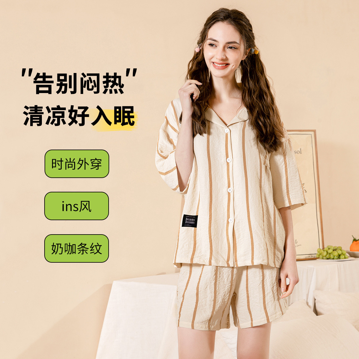 【时尚条纹】简约短袖短裤睡衣女夏季薄款可外穿家居服套装高级感 859083