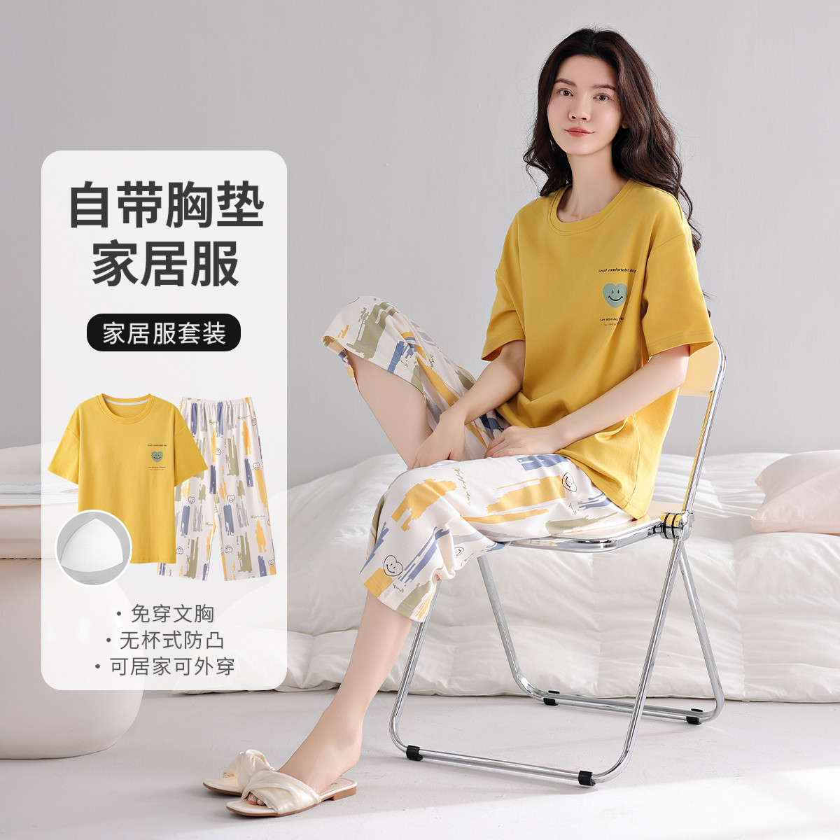 【春上新 带胸垫】短袖七分裤100%棉卡通笑脸圆领家居服套装 667467