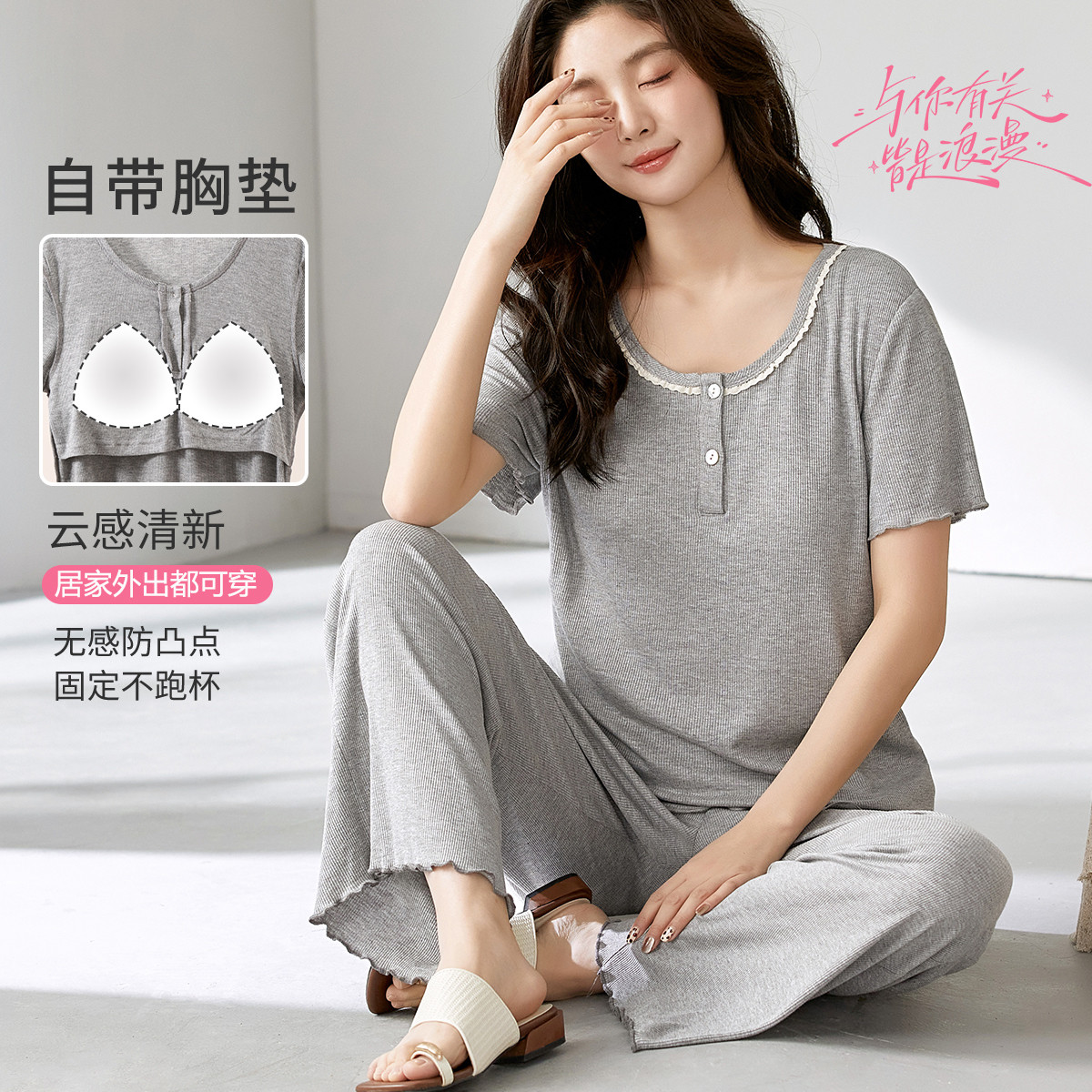 【居家空调服】自带胸垫花边减龄高级感短袖女士睡衣家居服套装 201822