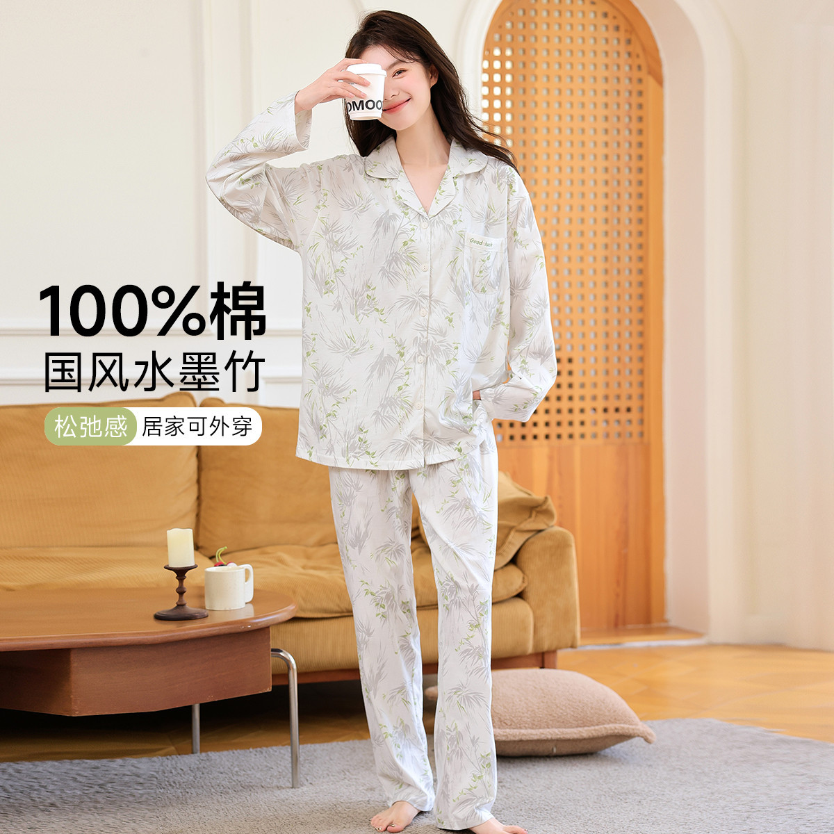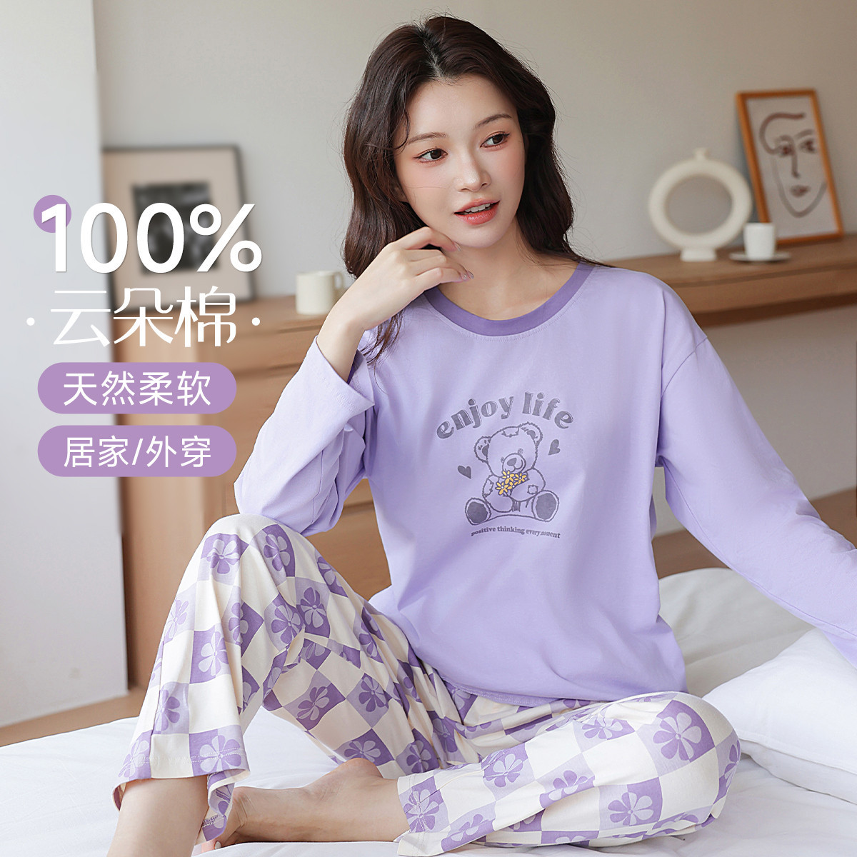 【100%棉】可外穿家居服套装女士春秋款高级感长袖长裤睡衣 607883