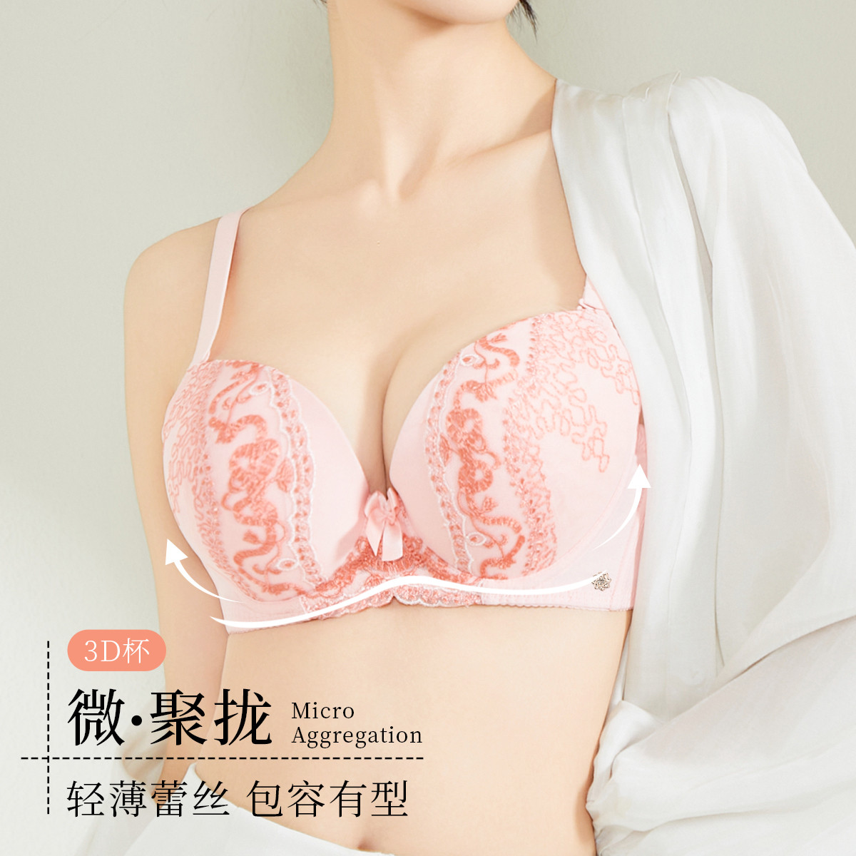女士内衣3/4中模杯舒适刺绣花边聚拢侧收薄透网布小胸款文胸罩 242123