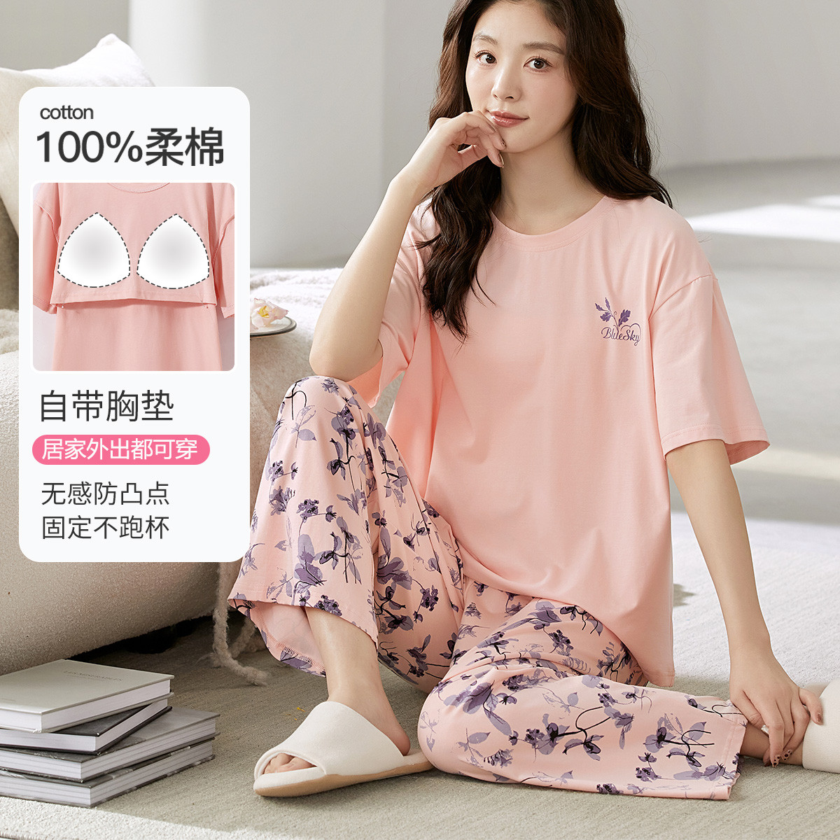 【100%透气纯棉】春夏新减龄高级感带胸垫女士家居服睡衣套装 736734