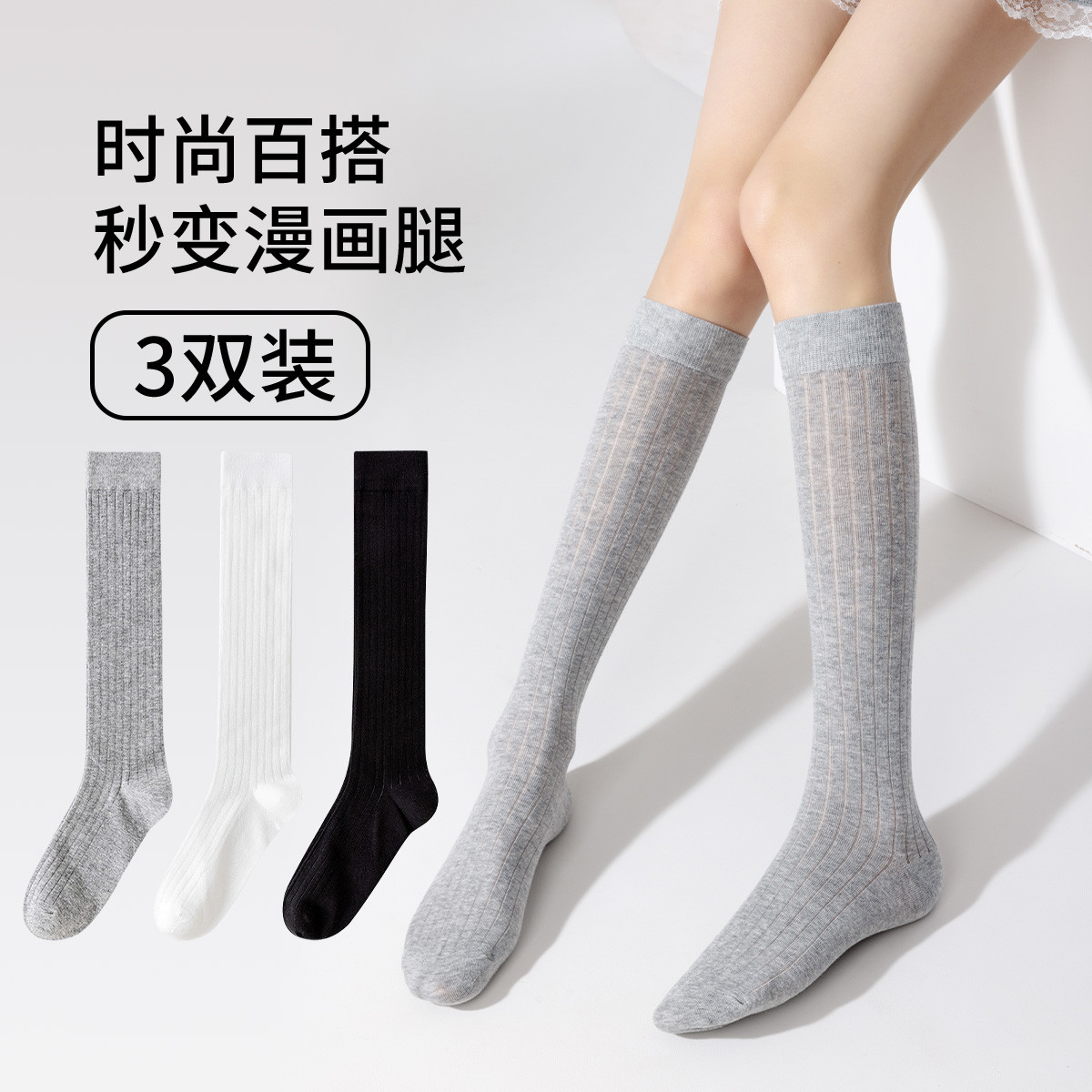 【百搭小腿袜】3双装女袜春款舒适棉柔纯色简约长筒袜微压显瘦 010891