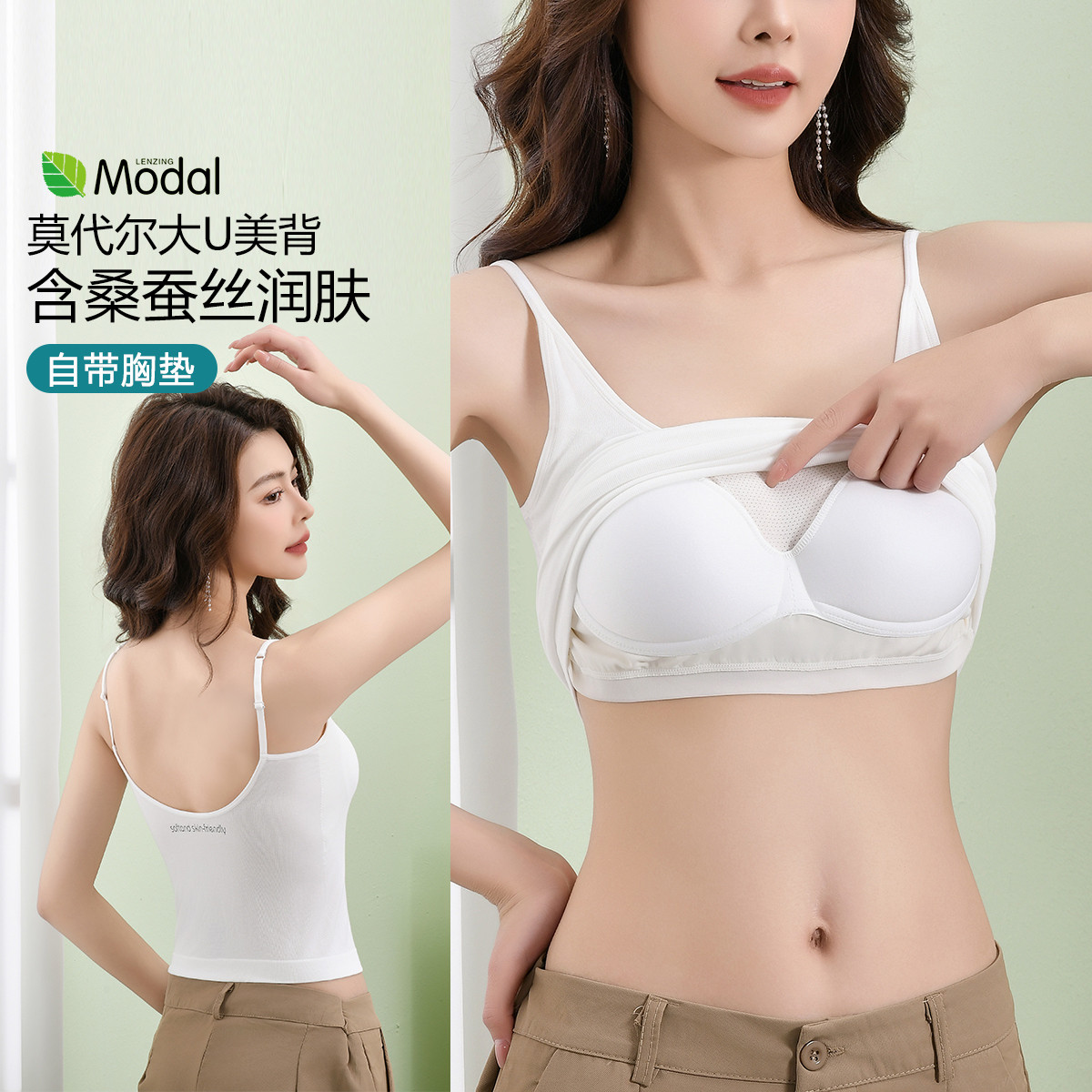 【含桑蚕丝润肤】春夏软糯莫代尔带固定胸垫女士打底吊带背心内衣 102046
