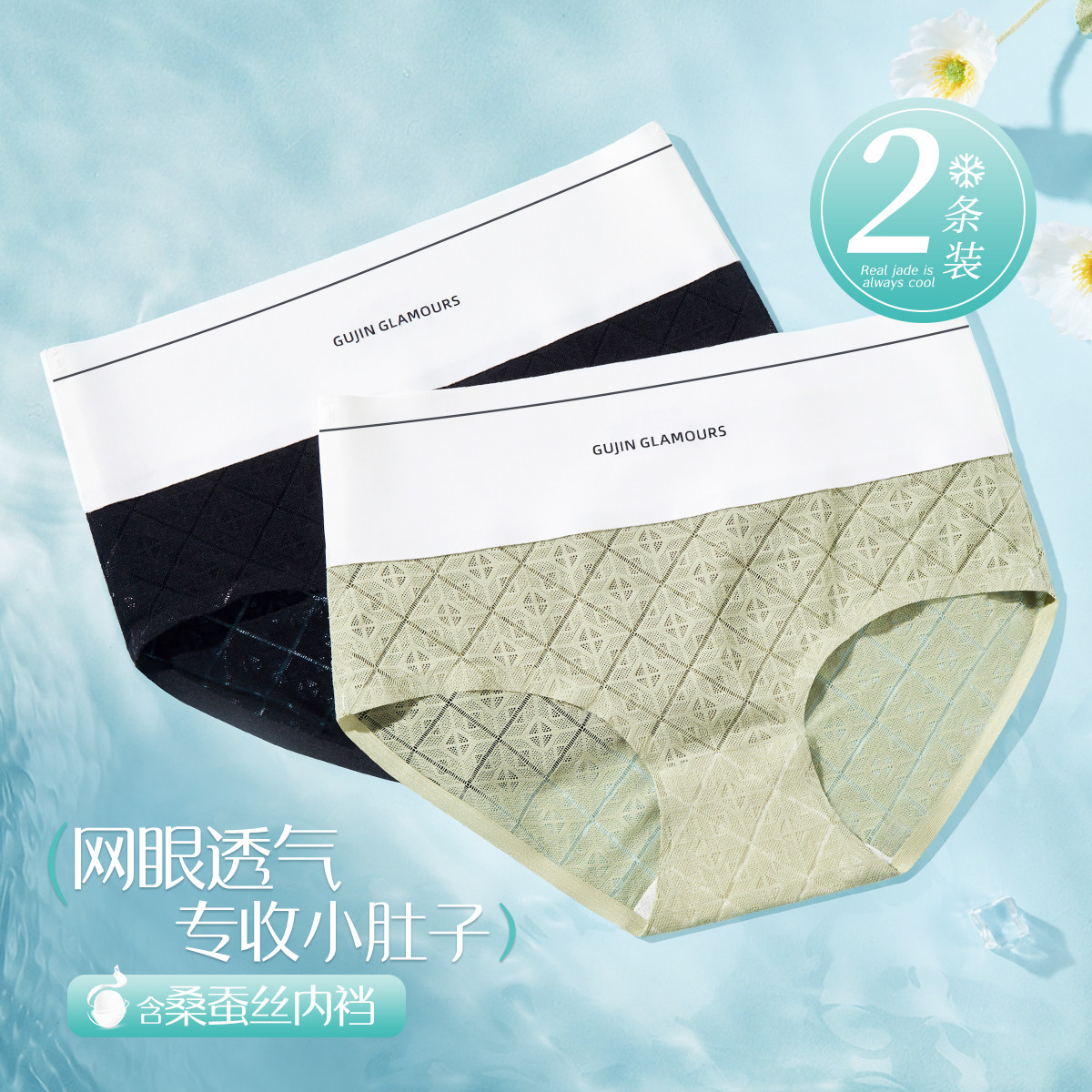 【含桑蚕丝底裆】2条装网眼易干女士内裤女无痕蕾丝高腰内裤 052107
