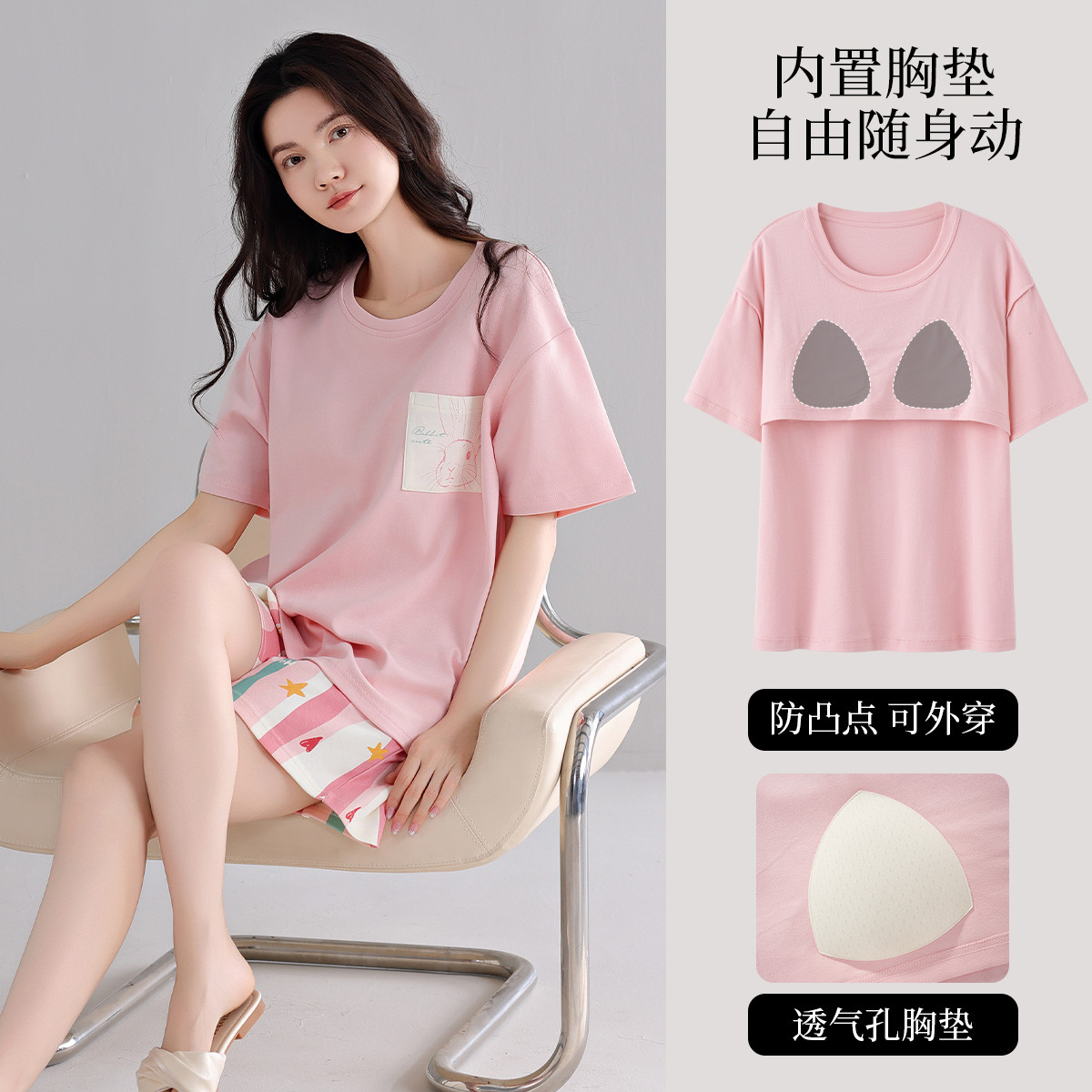 【带胸垫一体】睡衣女士春夏款圆领短袖短裤家居服套装可外穿 420875