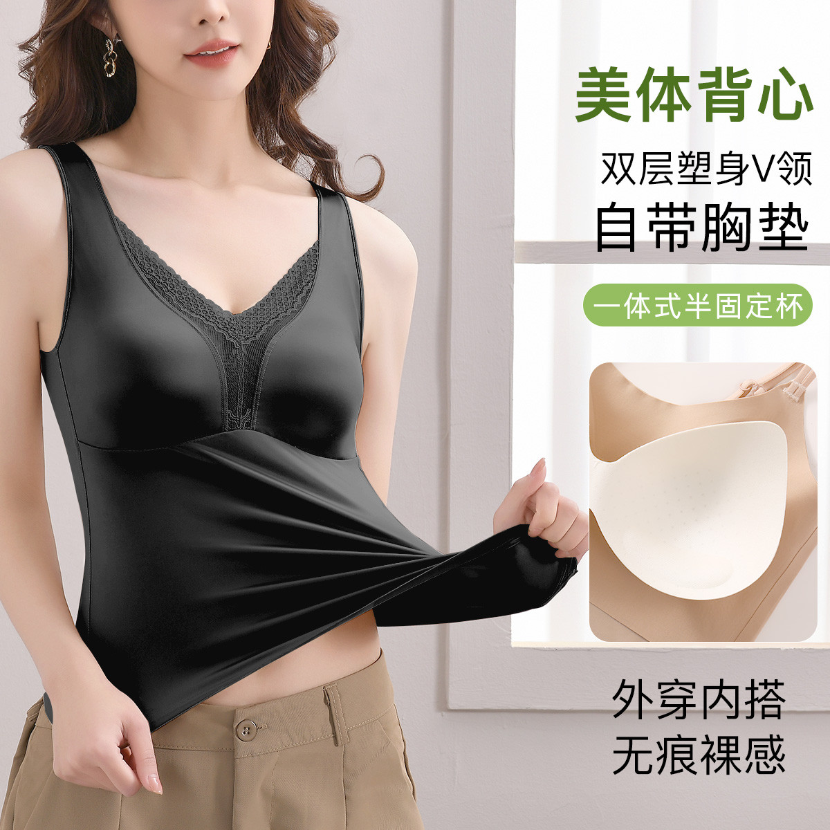 【轻奢缎面】带胸垫高级感蕾丝V领女士打底吊带背心U型美背内衣 982942