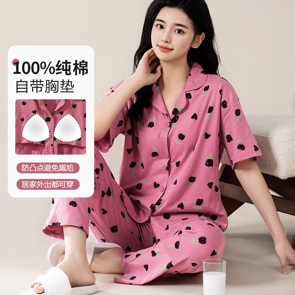 【100%亲肤纯棉】自带胸垫小清新舒适开衫两件套家居服女睡衣 477982