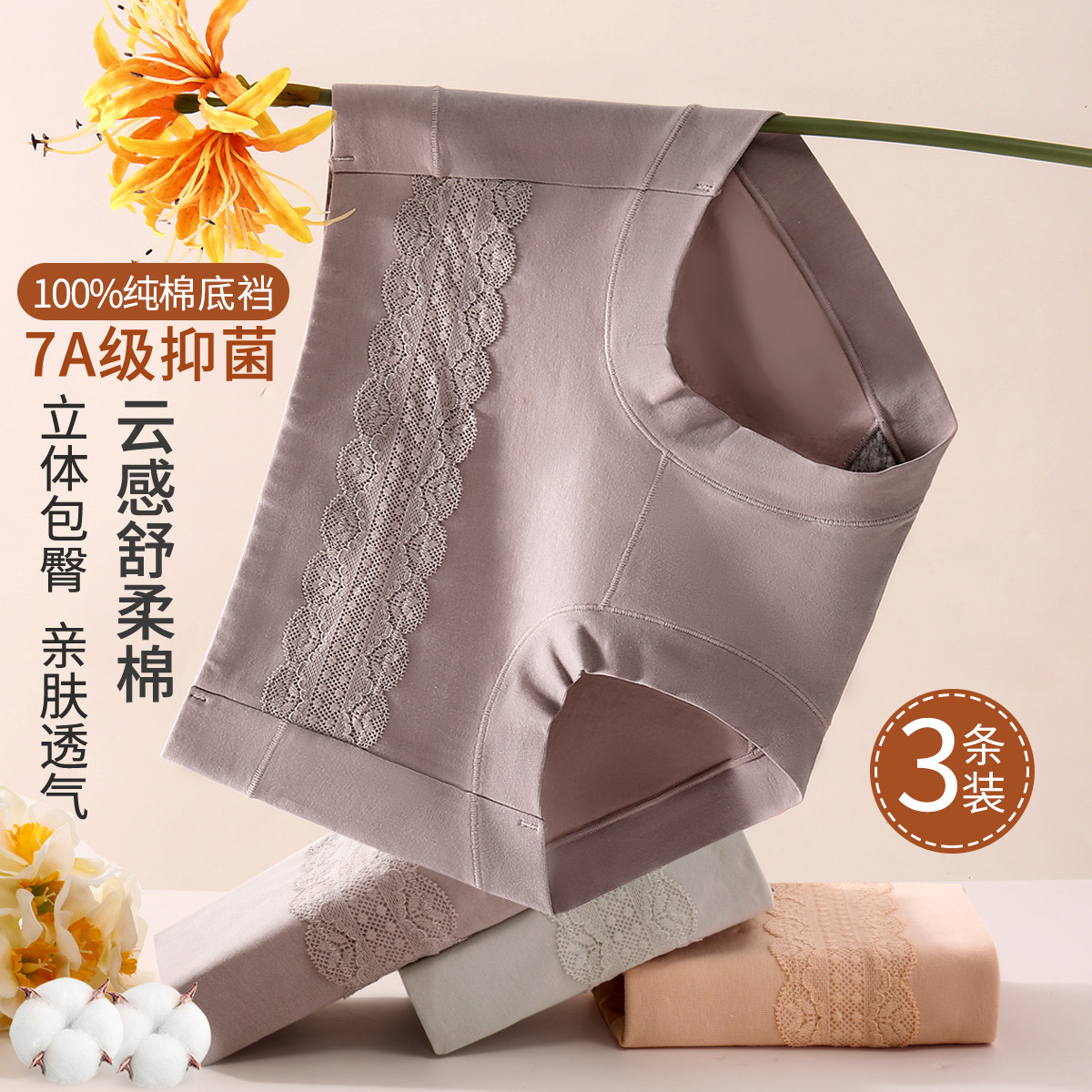 【7A抑菌立体包臀】纯棉底档蕾丝中高腰收腹提臀女士内裤3条装 005854