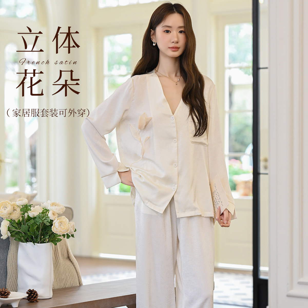 【立体郁金香】性感小香风睡衣女士春款高级感冰丝缎面家居服套装 101259