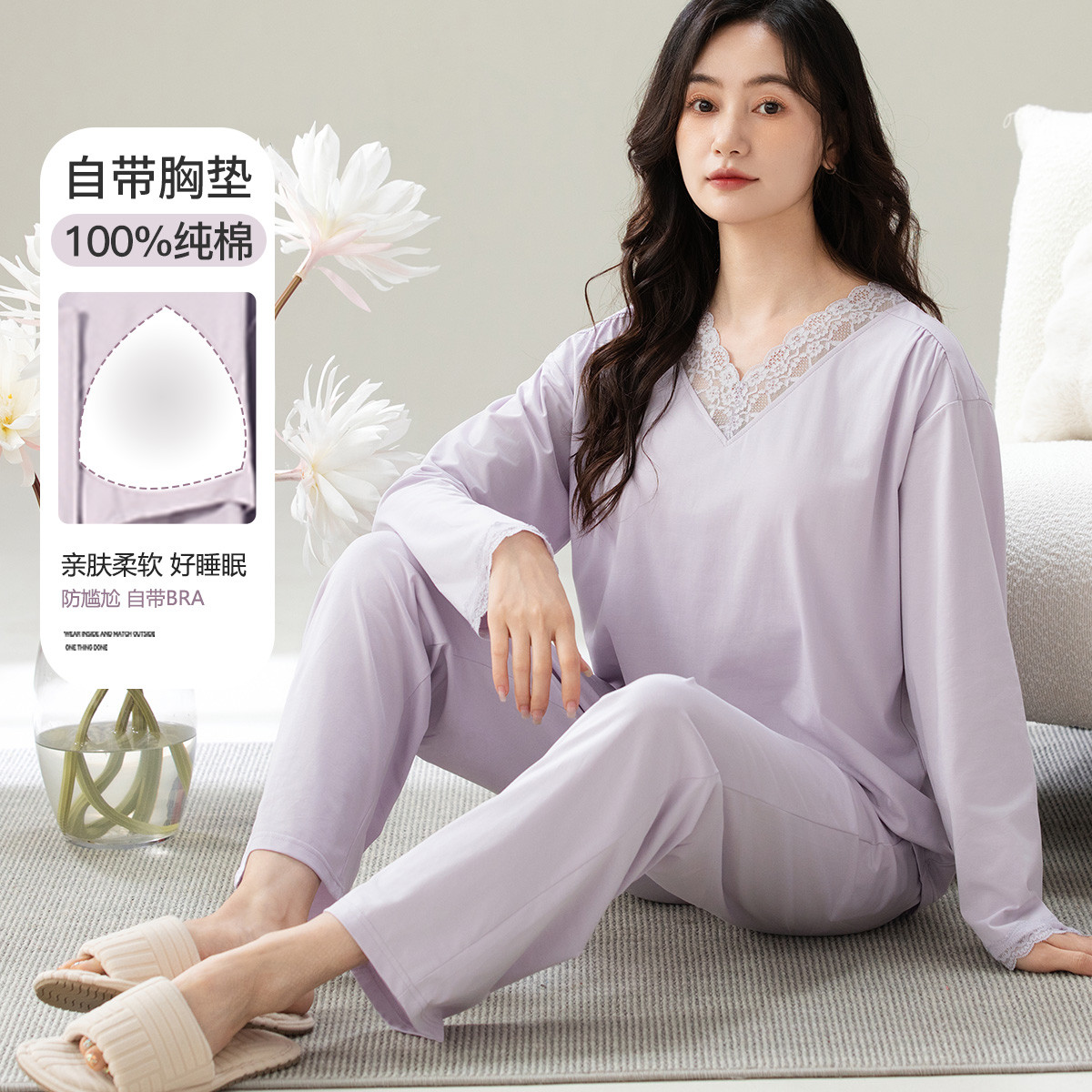 【100%棉亲肤柔软】自带胸垫睡衣女士家居服高级感可外出春秋 097822