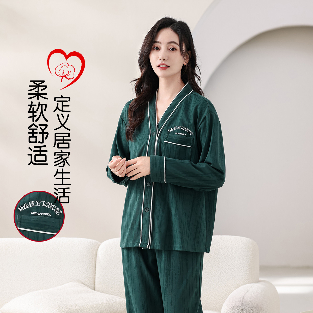 【V领小香风】舒适亲肤墨绿纹理女士家居服睡衣长袖春秋可外穿 017438