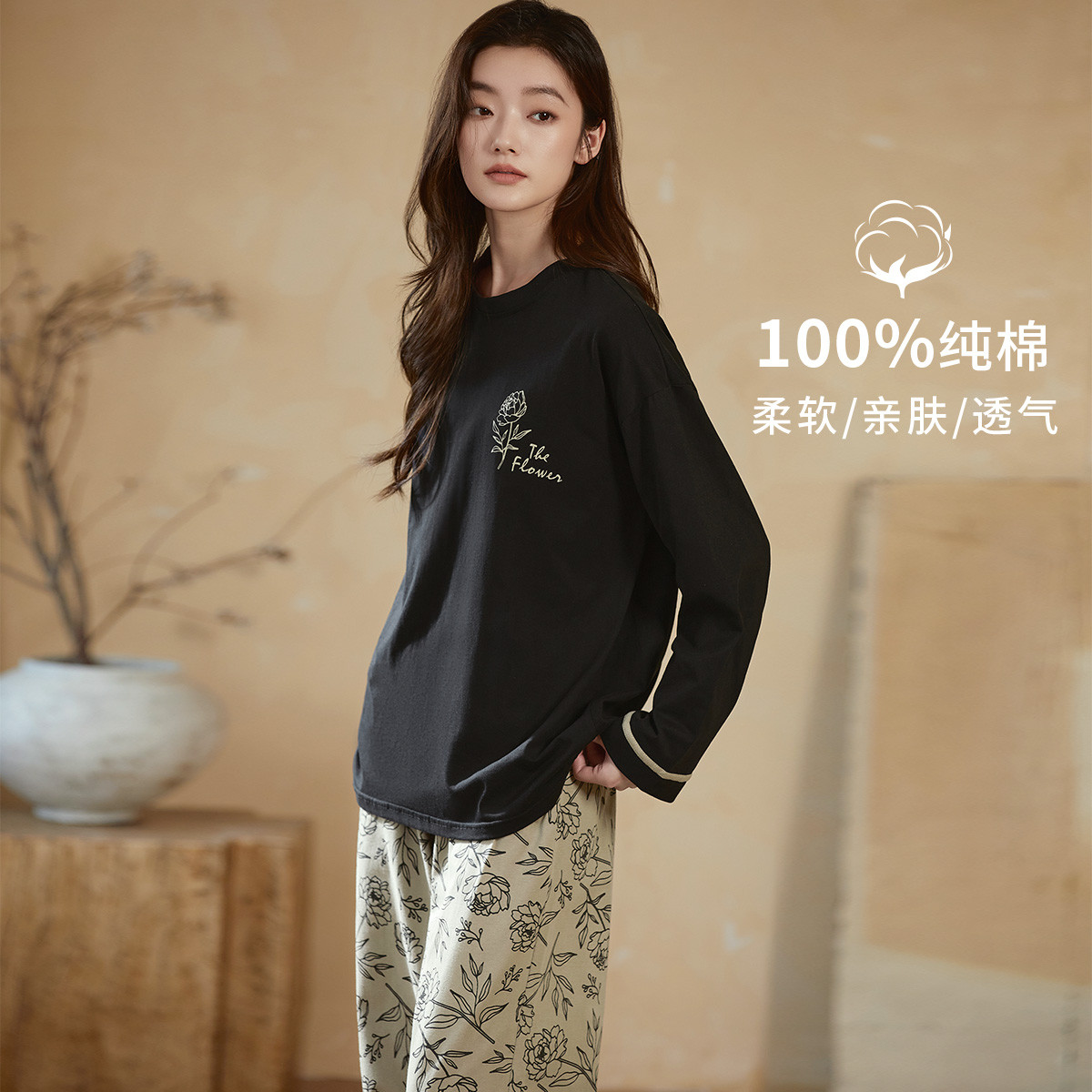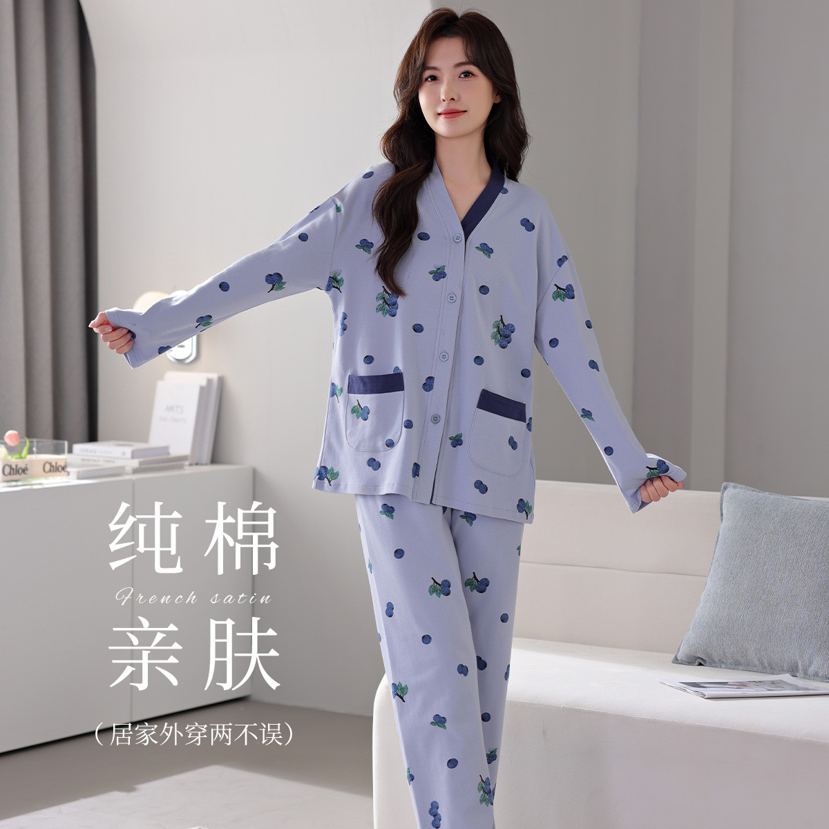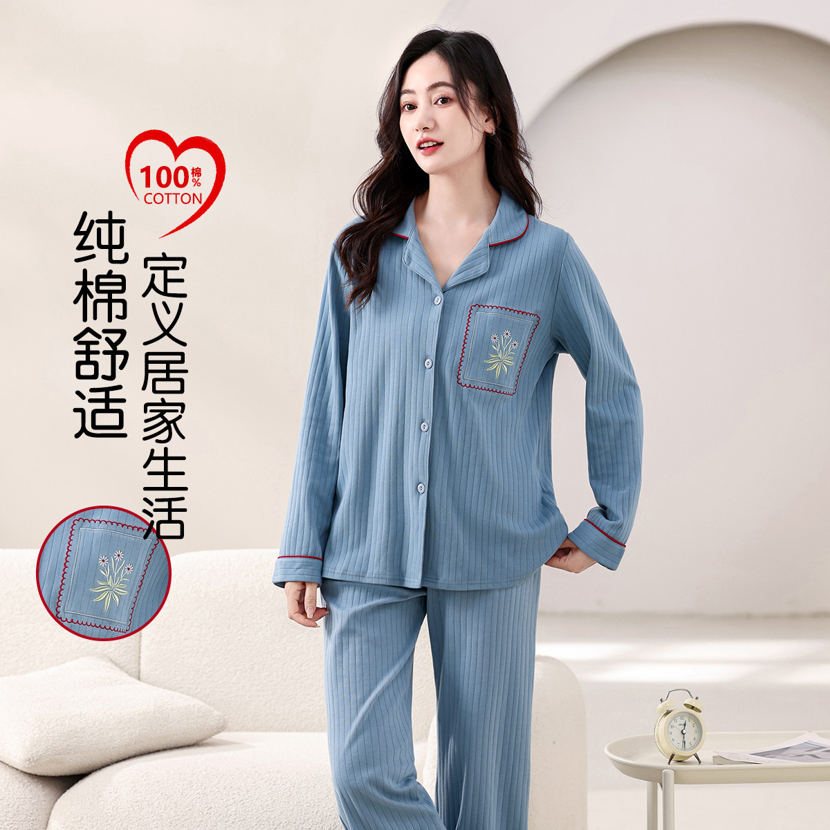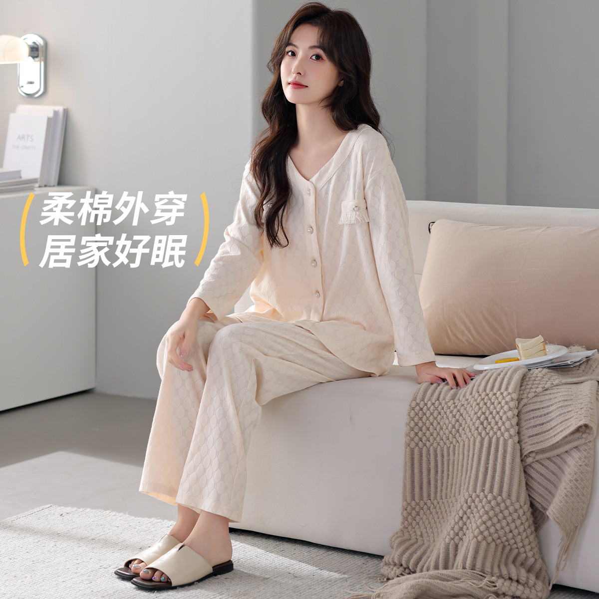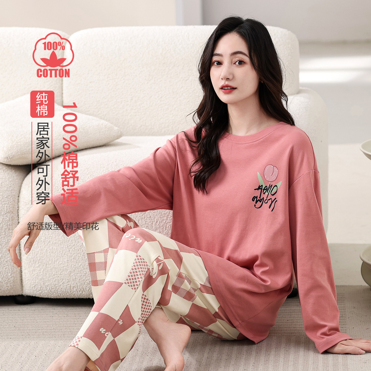 【100%棉】可外穿家居服套装女士春秋款高级感长袖长裤睡衣 607883