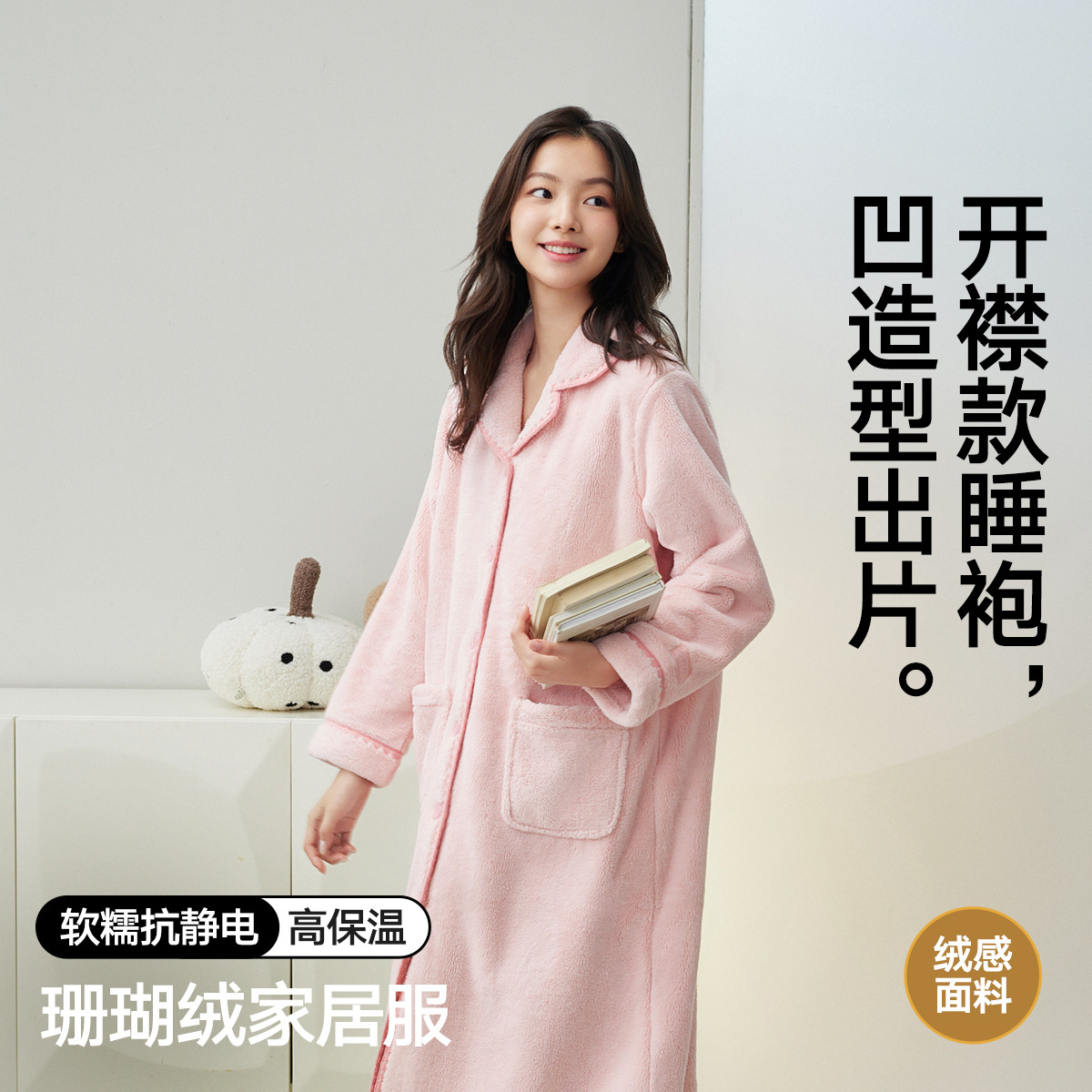 【抗静电 双面珊瑚绒】情侣款秋冬女士翻领抱抱绒睡袍绒感保温 966042