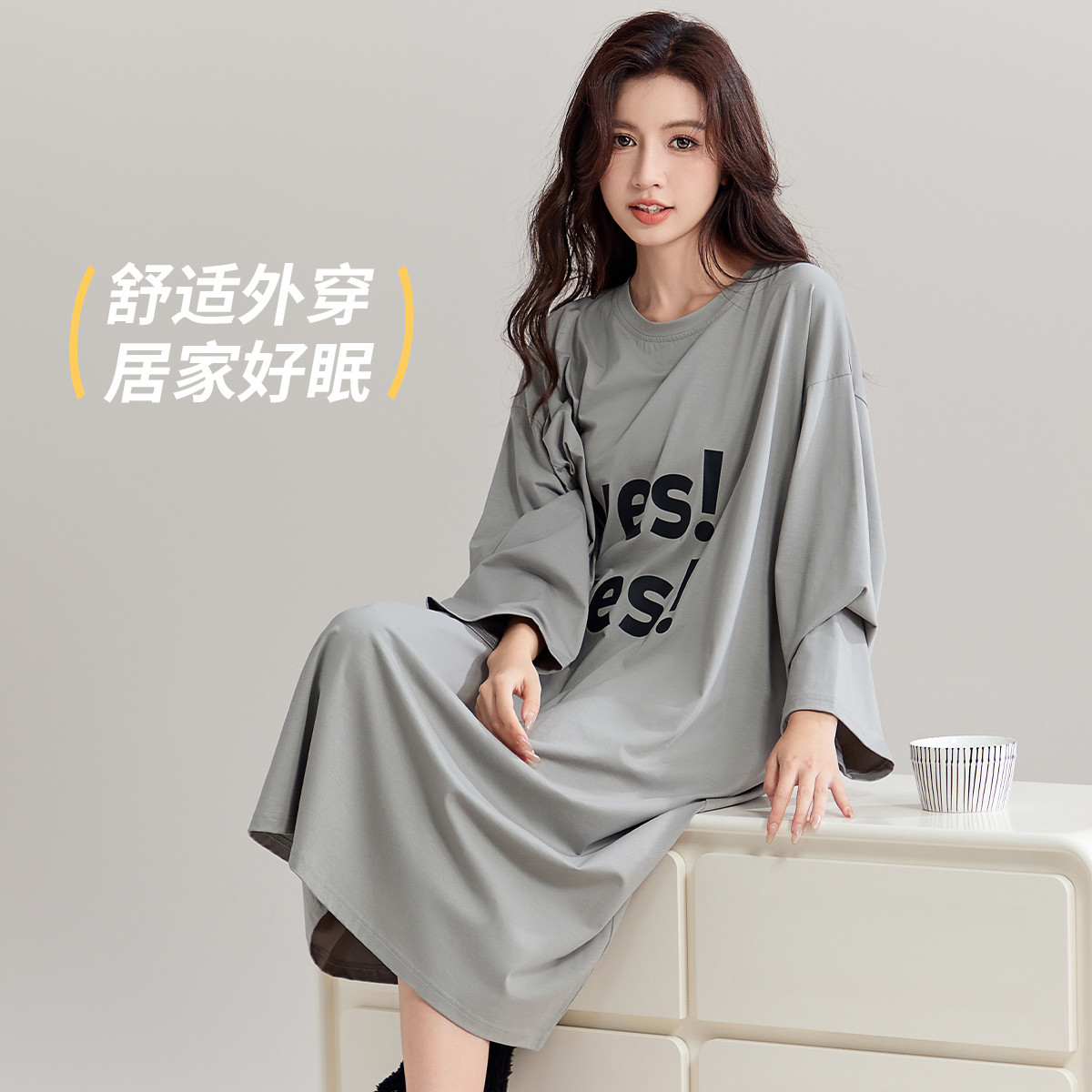 【字母印花】春秋款宽松睡裙女士长袖纯棉柔软睡衣家居服可外穿 604811