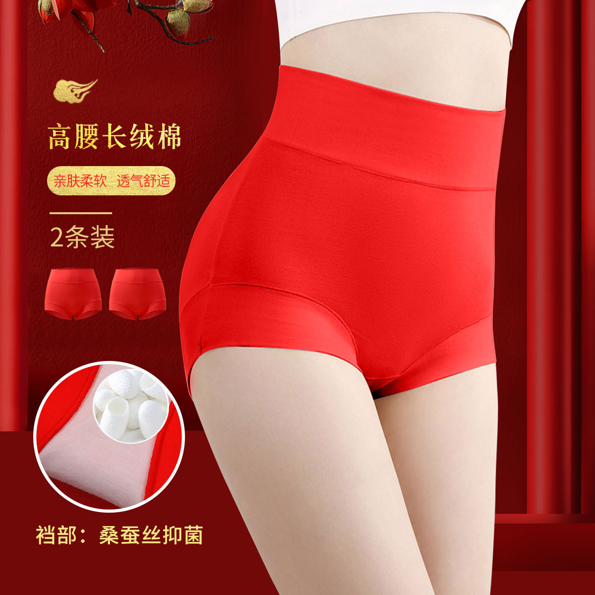 【鸿运婚庆大红内裤】2条高腰收腹提臀桑蚕丝抑菌裆棉女士内裤 688030