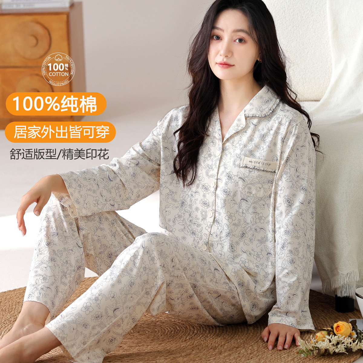 【100%棉】春秋印花高级感舒适开衫睡衣睡裤女士家居服可外穿 394334