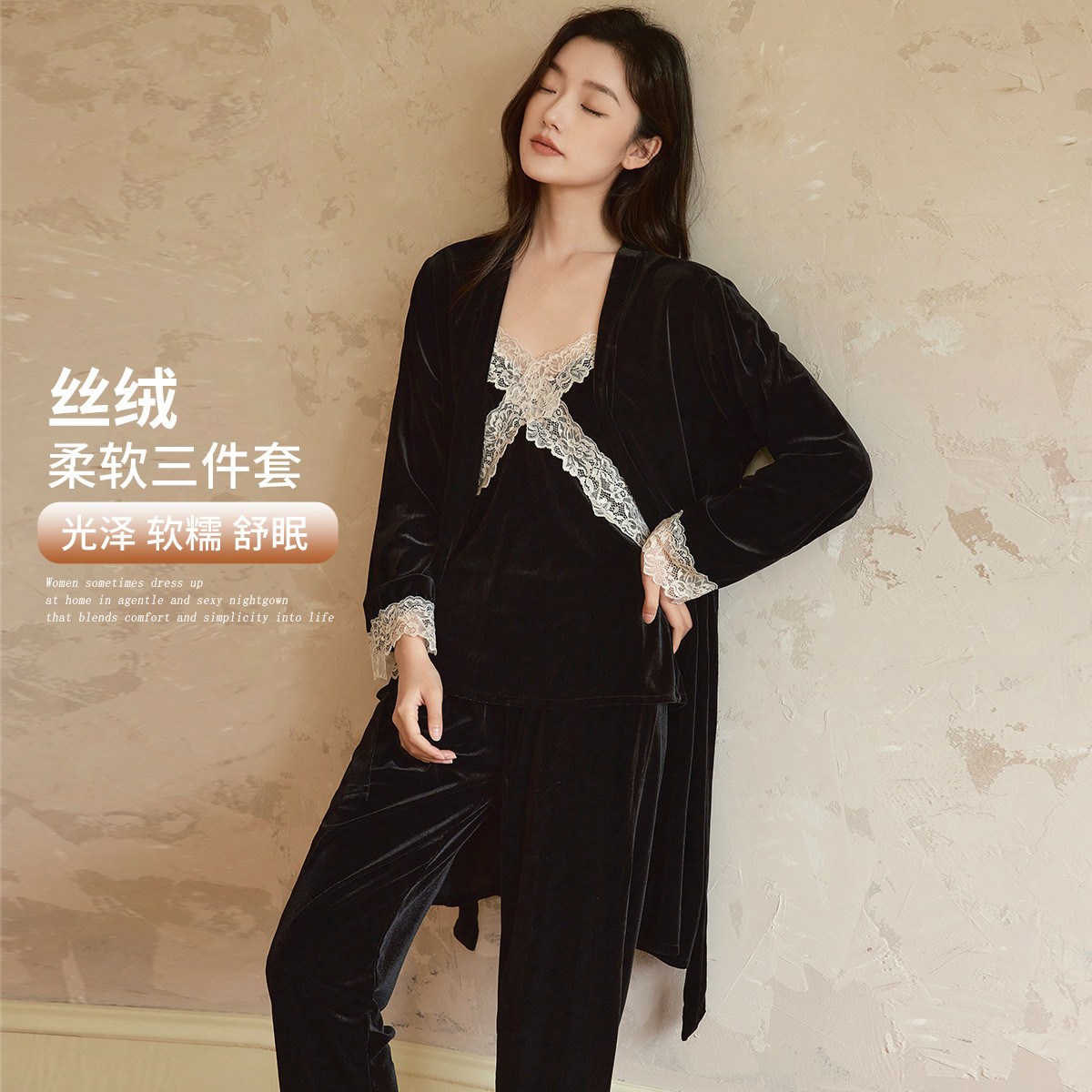 韩系高级感性感蕾丝吊带睡衣三件套女士家居服柔软亲肤丝滑舒适 912587