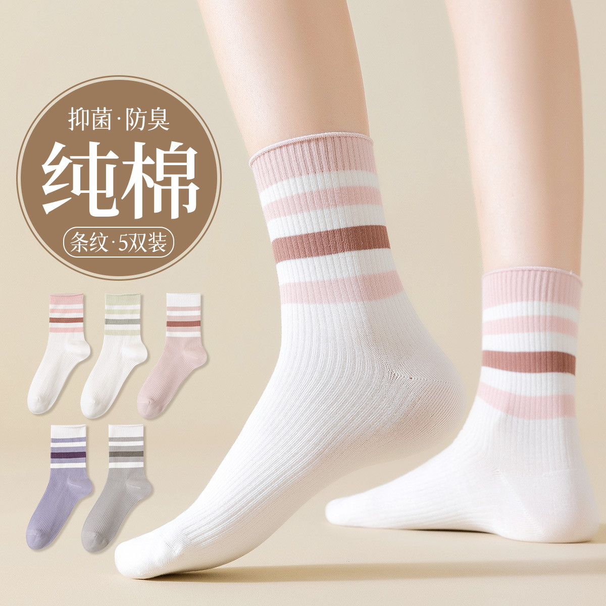 5双装【100%棉】秋冬女士袜子女抑菌防臭中筒袜经典条纹女袜 529867