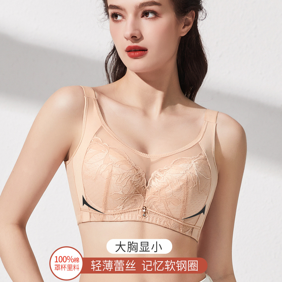 【100%棉里杯】大胸显小轻薄蕾丝记忆软钢圈收副乳防下垂文胸 487902