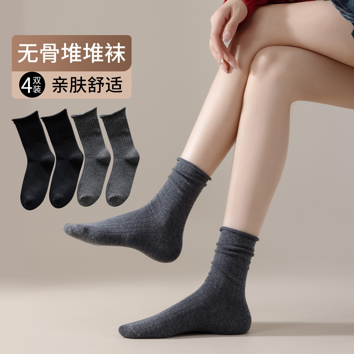 【精梳棉】4双卷边无骨堆堆袜女袜纯色百搭透气女士中筒袜子 421131