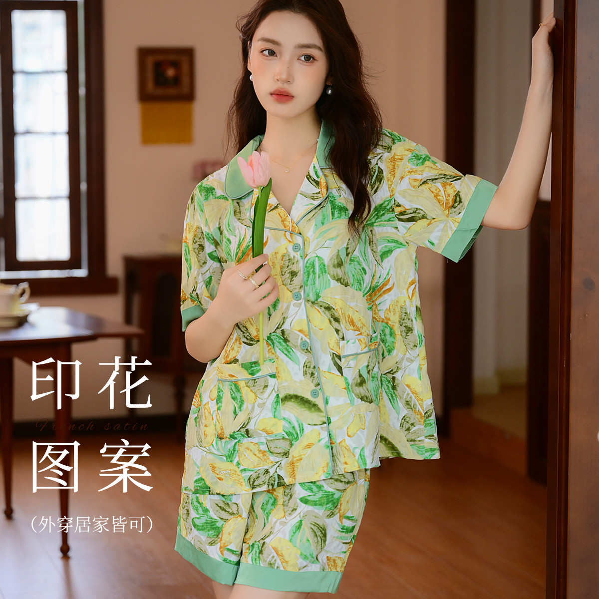 【设计感印花】可外穿冰丝睡衣女士夏季薄款短袖短裤家居服套装 254667