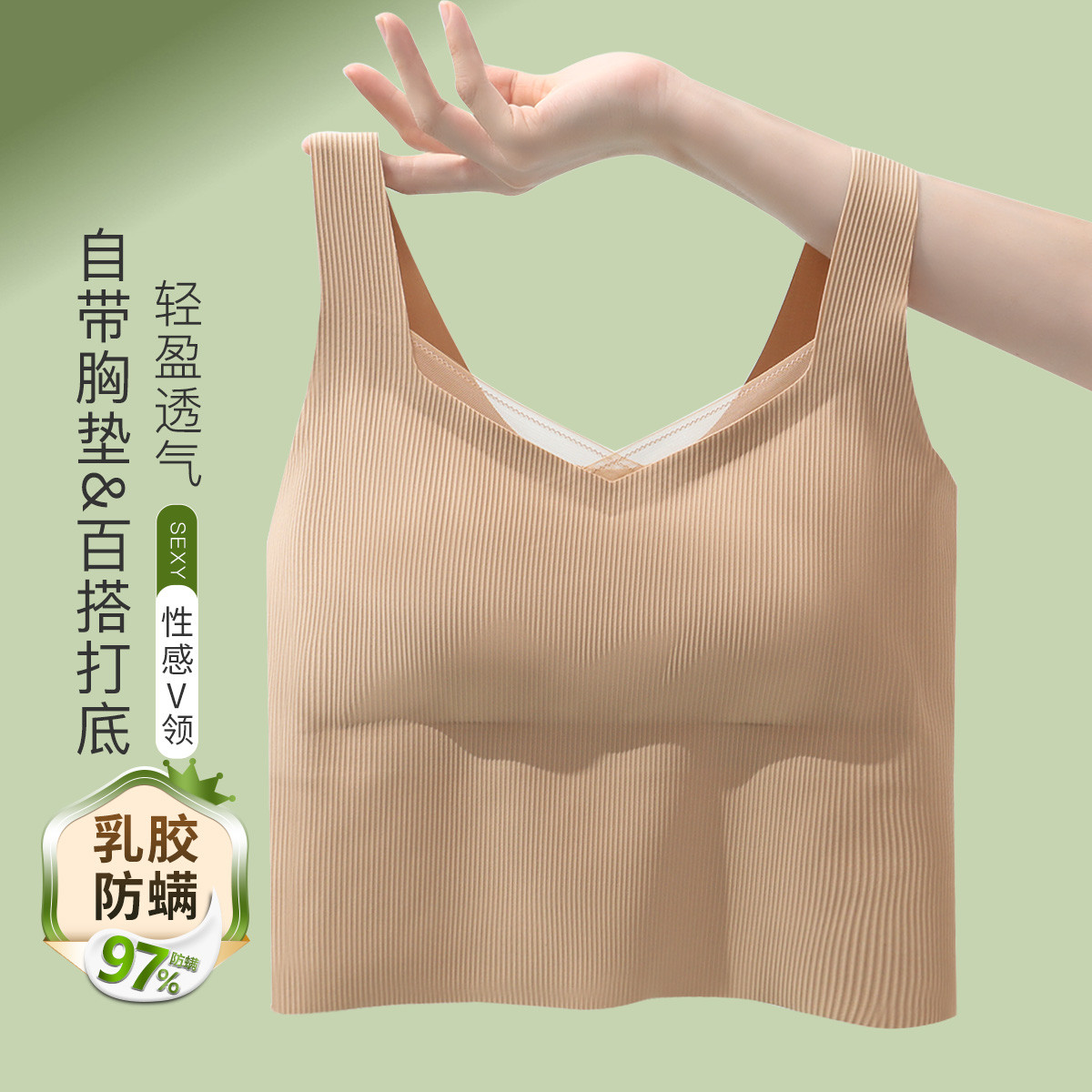 【文胸一体】含乳胶垫防螨轻盈透气百搭V领内衣女士吊带打底背心 531678
