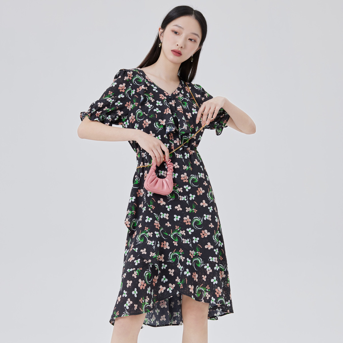 【商场同款】优雅气质荷叶领碎花裙夏季收腰显瘦短袖连衣裙子女 213526