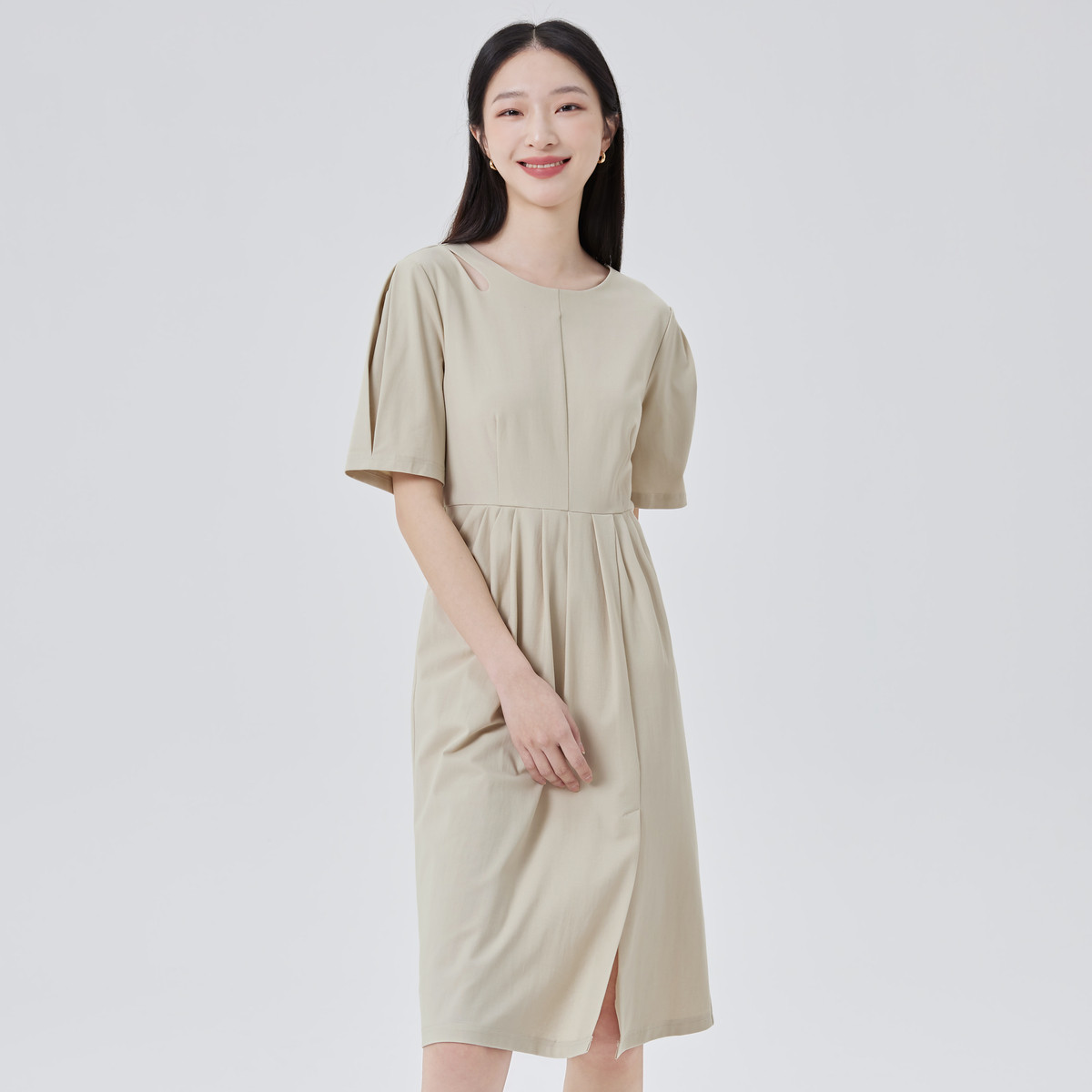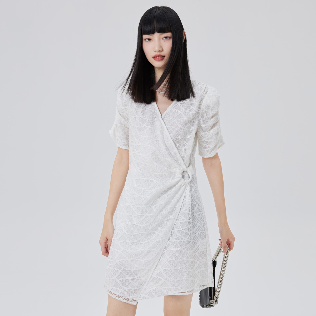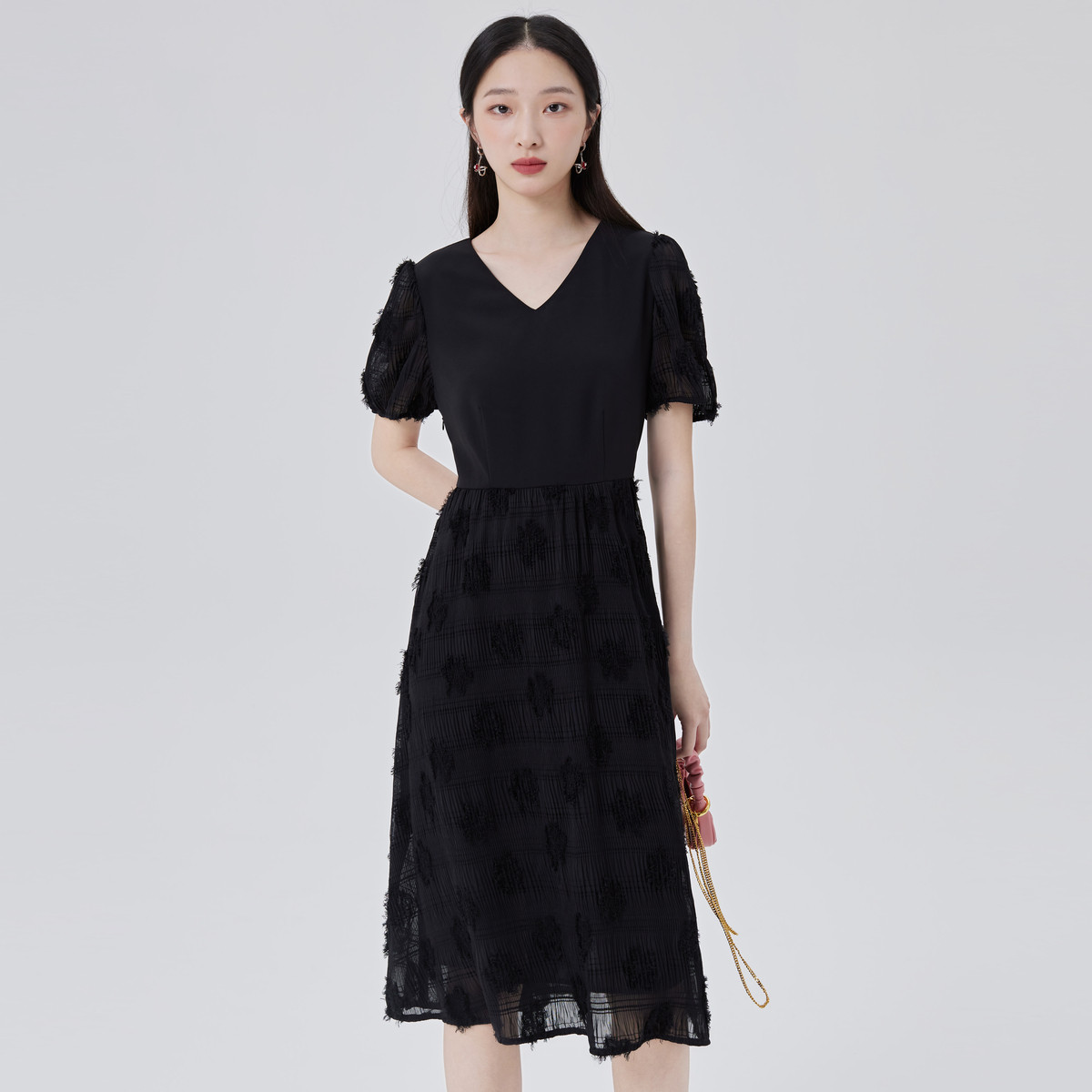 【商场同款】性感开叉裙领口镂空短袖连衣裙子女式A字中长裙 047702