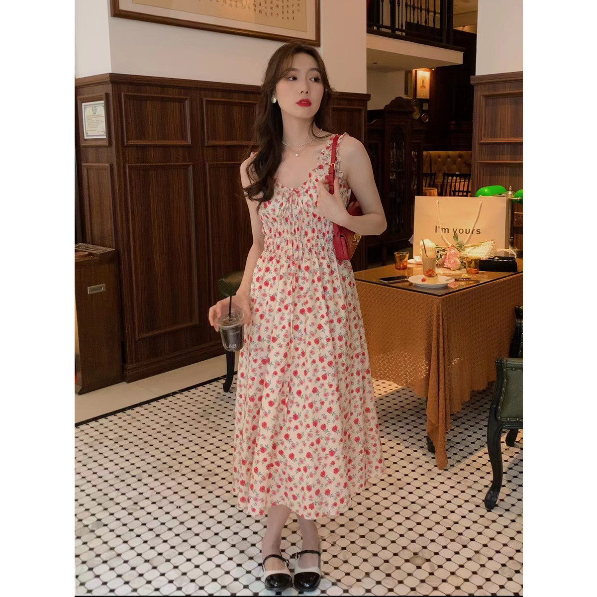【100%棉】春夏款茶歇碎花吊带连衣裙女御姐高级感A字裙长裙 476419