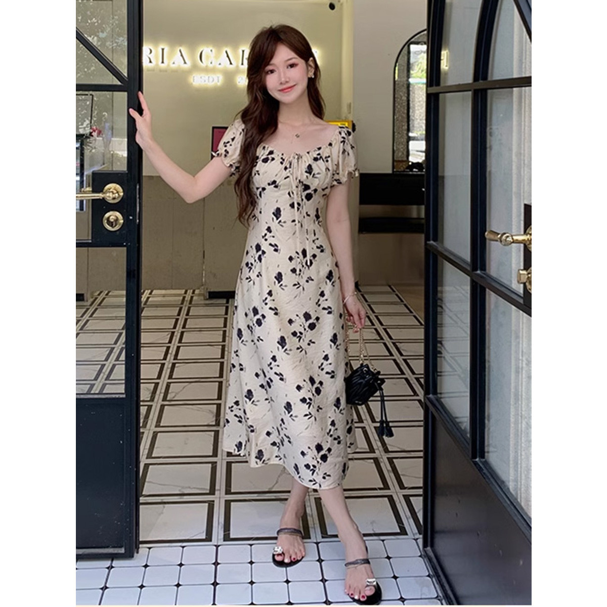 法式茶歇方领碎花连衣裙女泡泡袖显瘦绑带气质包臀长裙女 084803