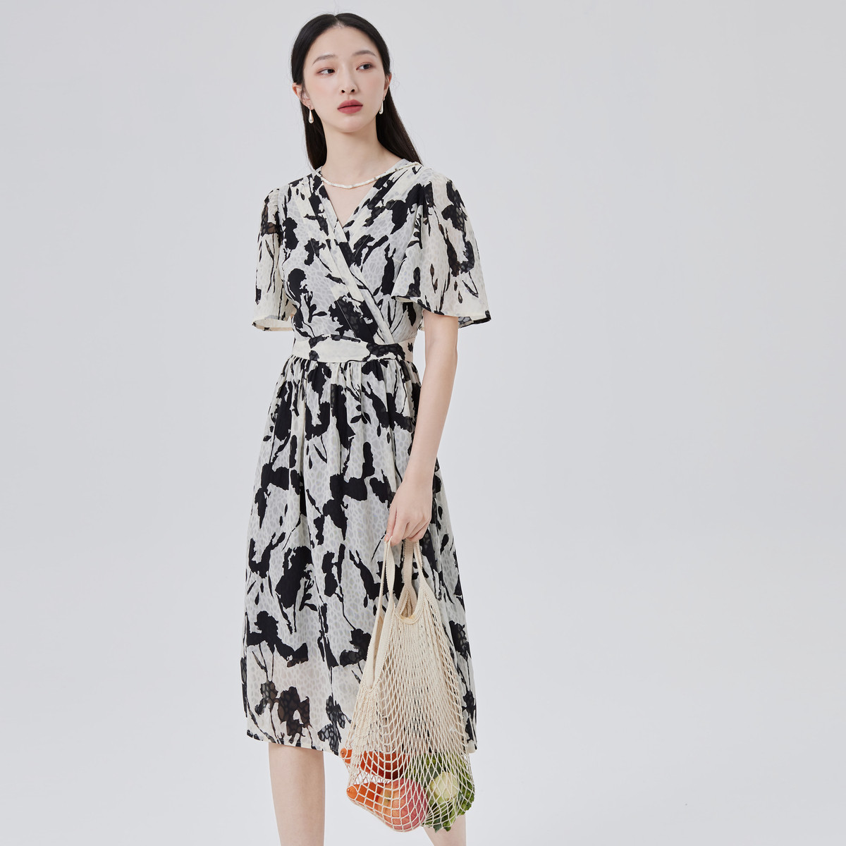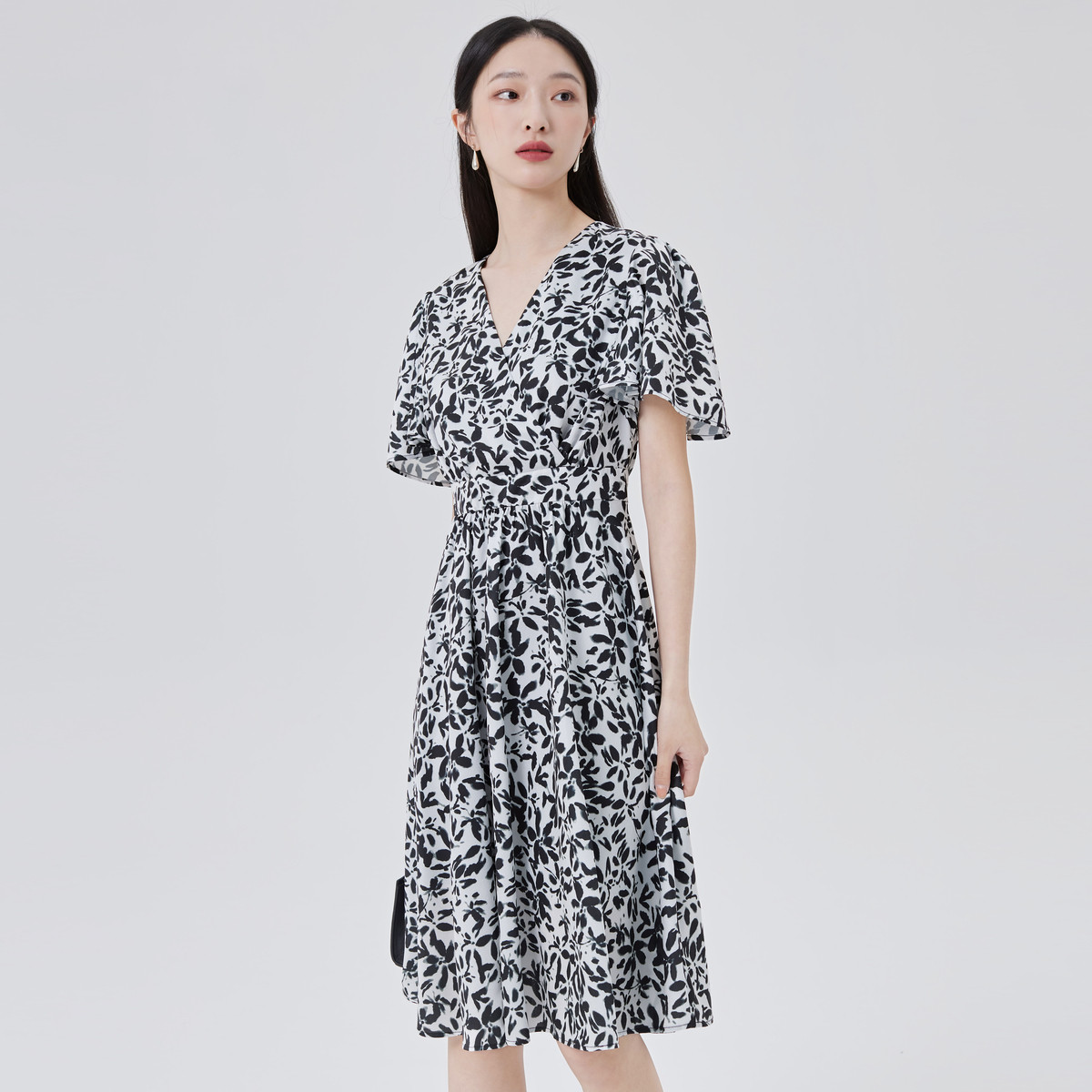 【商场同款】优雅气质叠门碎花裙短袖V领中长裙子女显瘦A字裙 271382