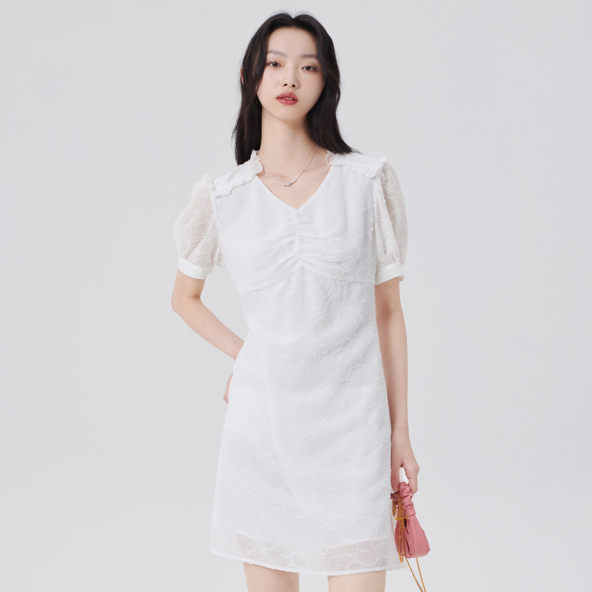 夏装v领褶皱荷叶边连衣裙女假两件气质显瘦短裙 979220
