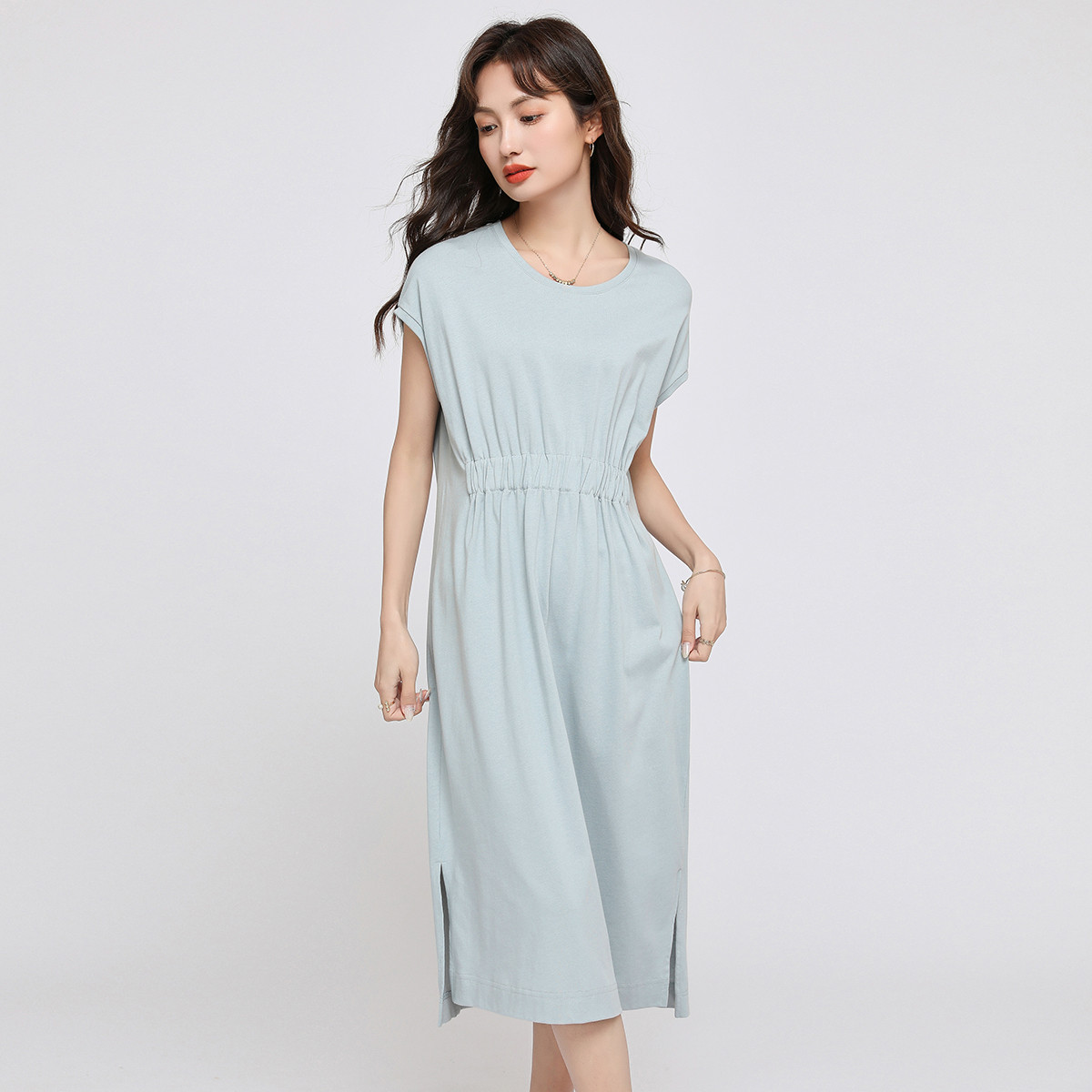连衣裙女夏季连袖收腰显瘦a字裙休闲开叉长裙 952280
