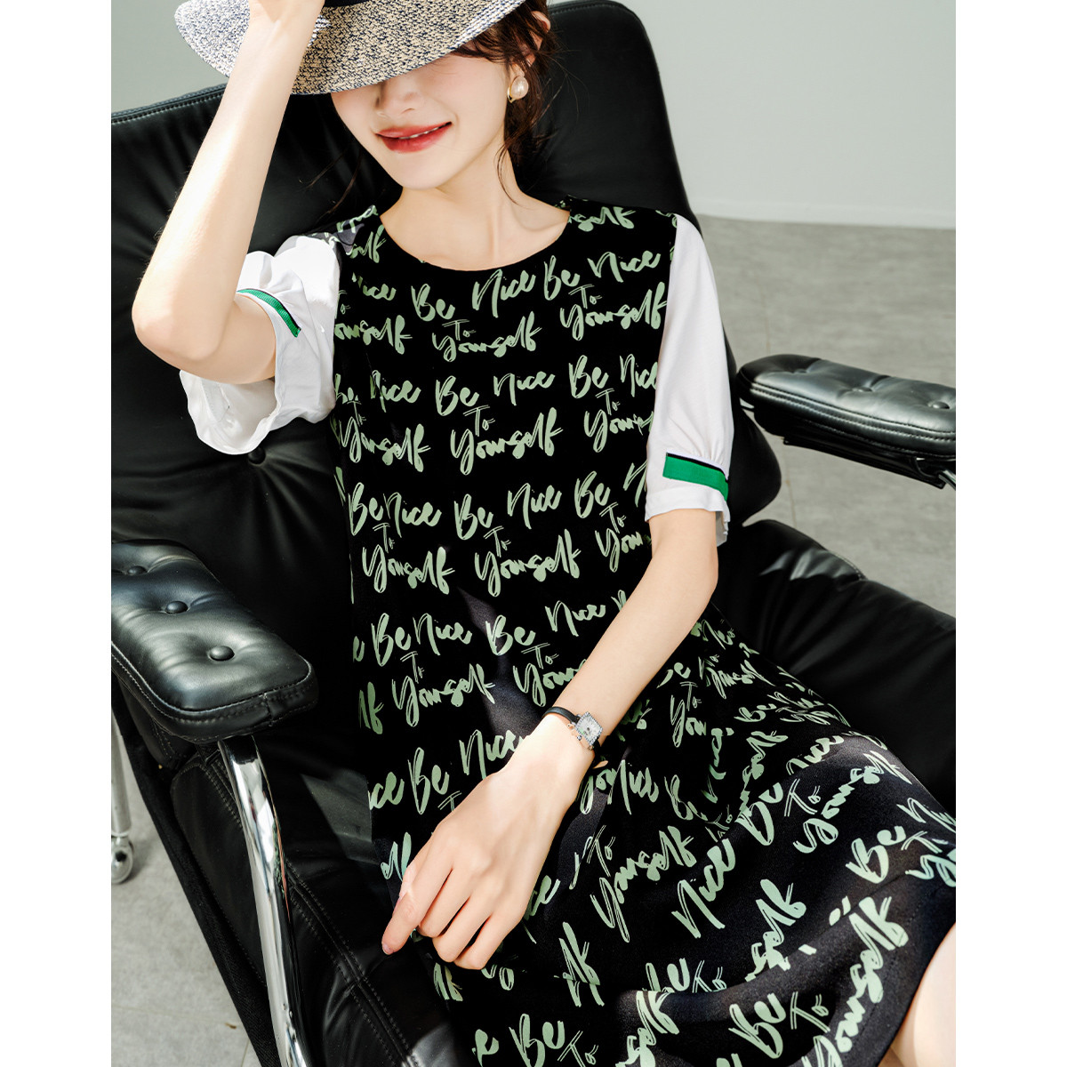 2025夏季新款法式复古宽松显瘦高级感拼接小众字母印花连衣裙 421385