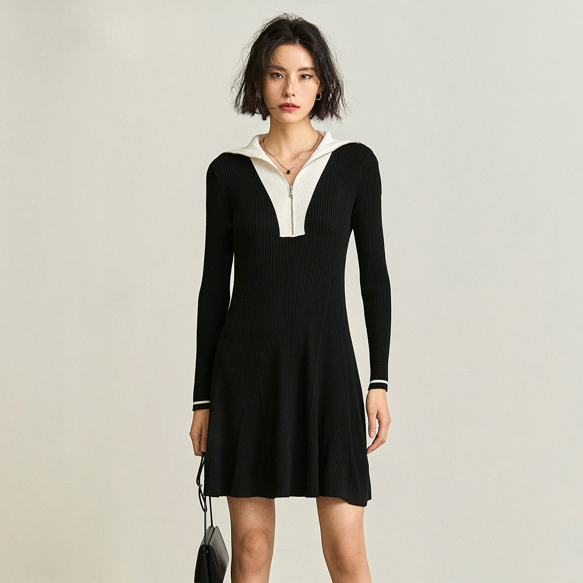 通勤设计感撞色复古拉链翻领针织黑色连衣裙 538587