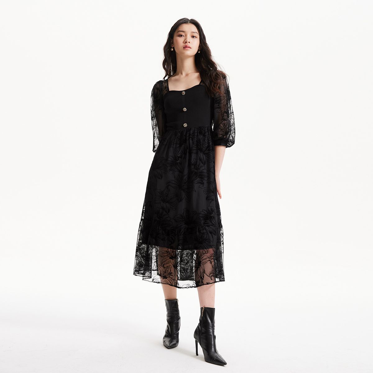 连衣裙优雅气质长裙七分袖方领拼接黑色女 987345