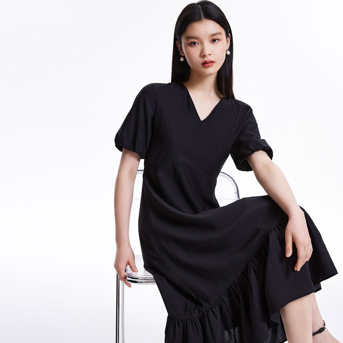 【荷叶边】连衣裙宽松V领花苞短袖荷叶边长裙女人味高级感 363473