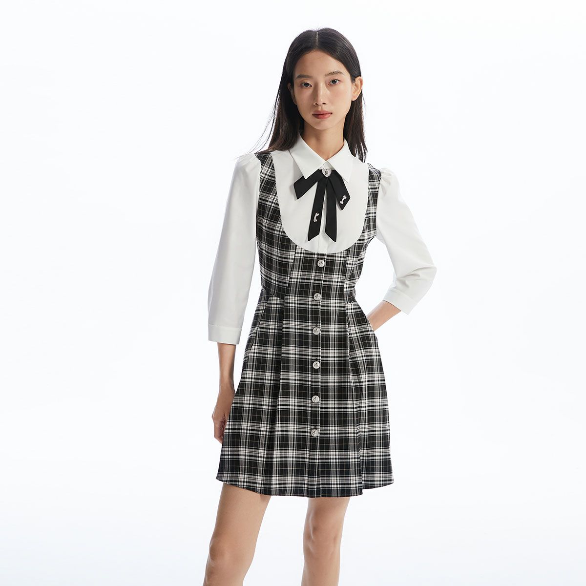 春夏款学院风格纹拼接假两件七分袖连衣裙气质百搭时尚 466449