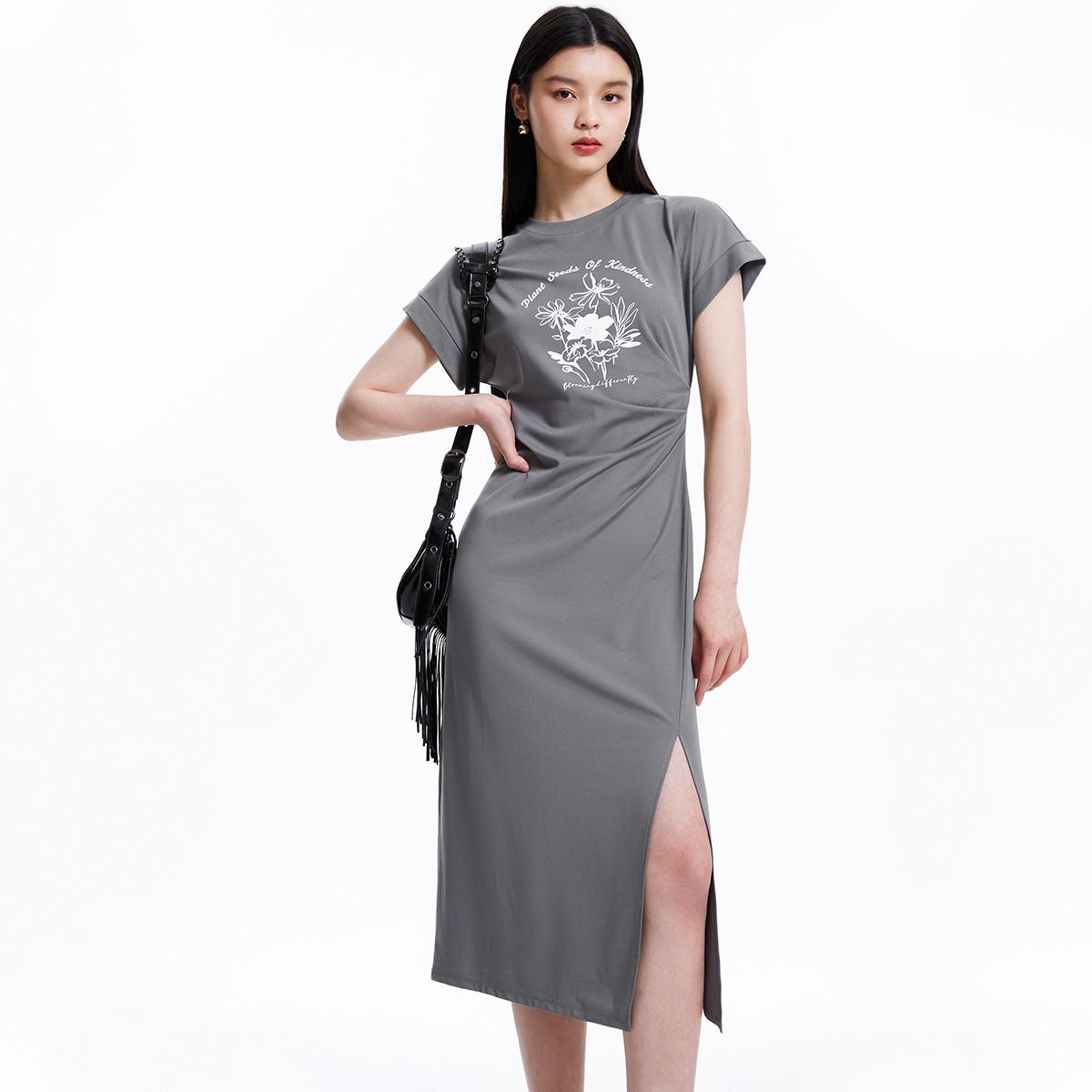 连衣裙圆领收腰褶皱印花美式辣妹开叉T恤裙 183249