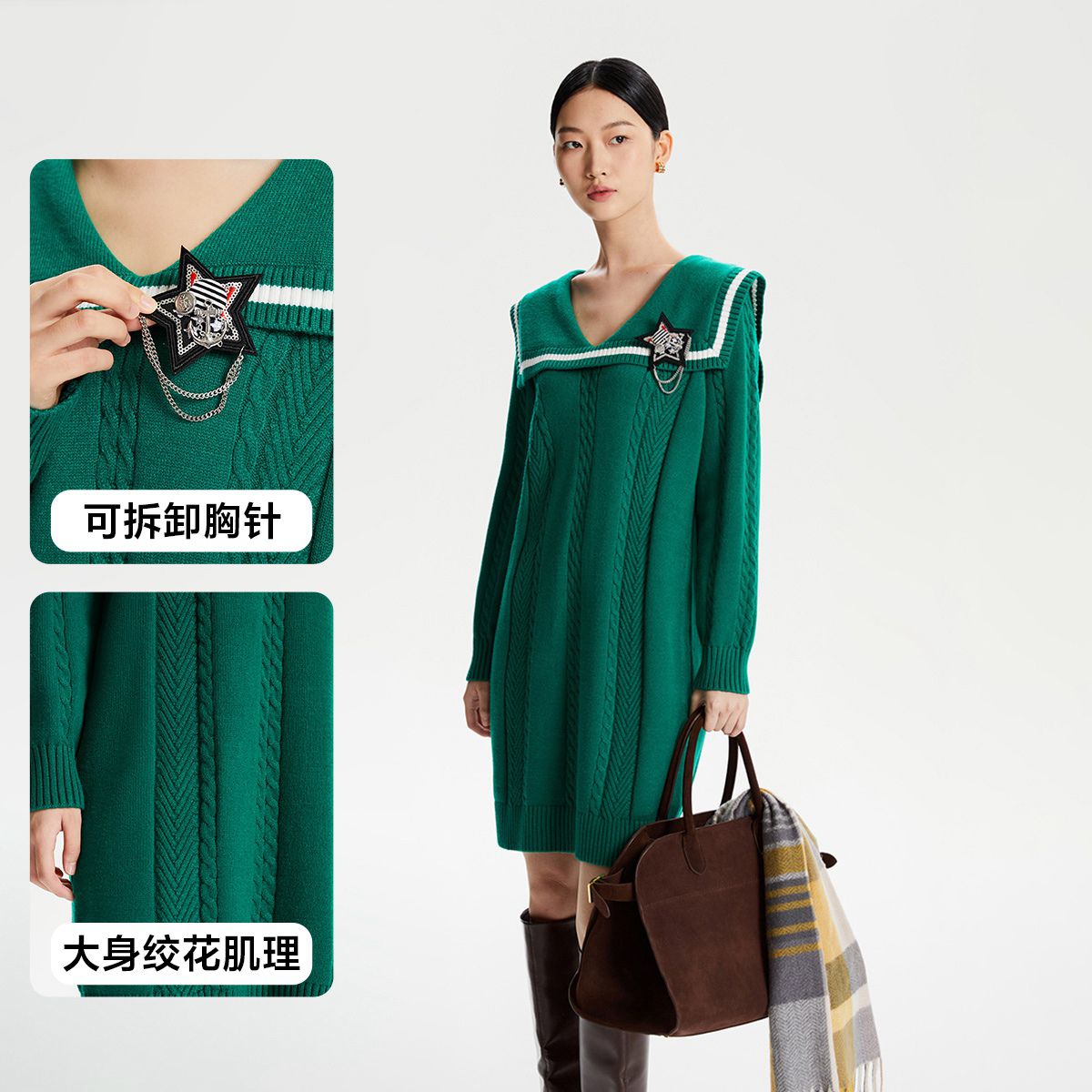 【专柜款】春夏宽松撞色v形海军领休闲学院风针织连衣裙百搭时尚 977745