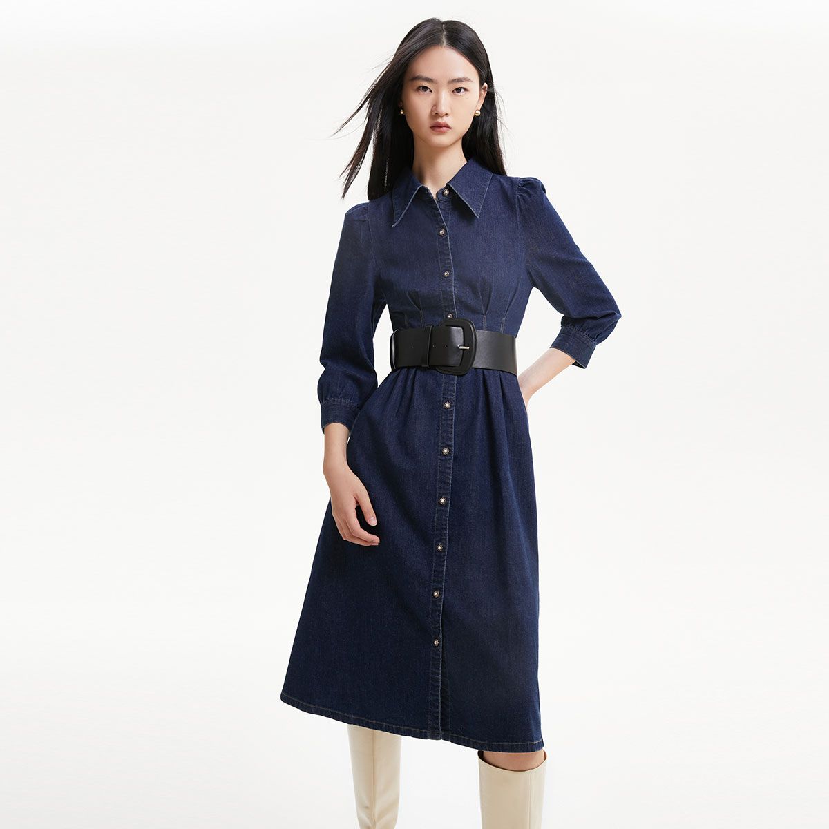连衣裙收腰泡泡袖牛仔衬衫裙 231313
