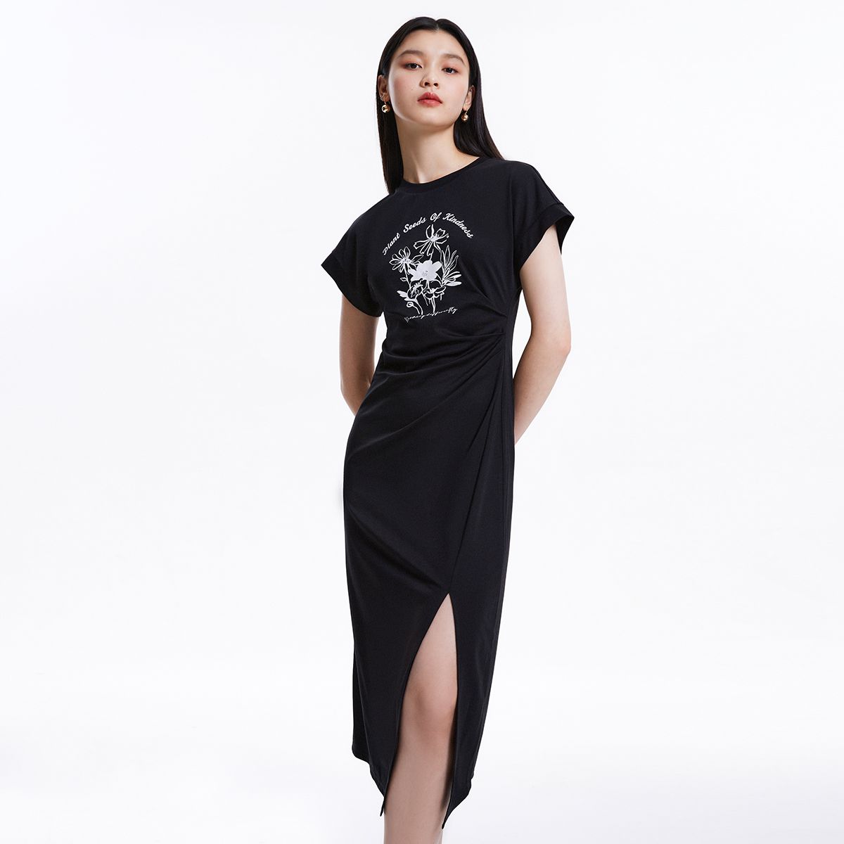 连衣裙圆领收腰褶皱印花美式辣妹开叉T恤裙 162769