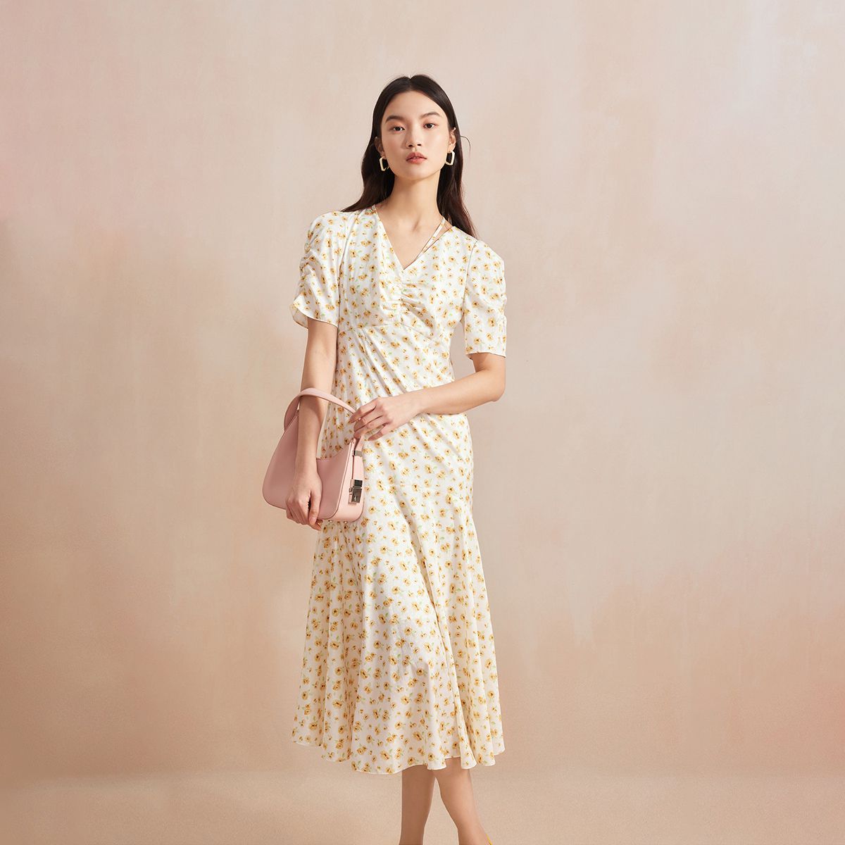 碎花复古风设计感不规则下摆V领短袖荷叶边显瘦收腰连衣裙女 368707