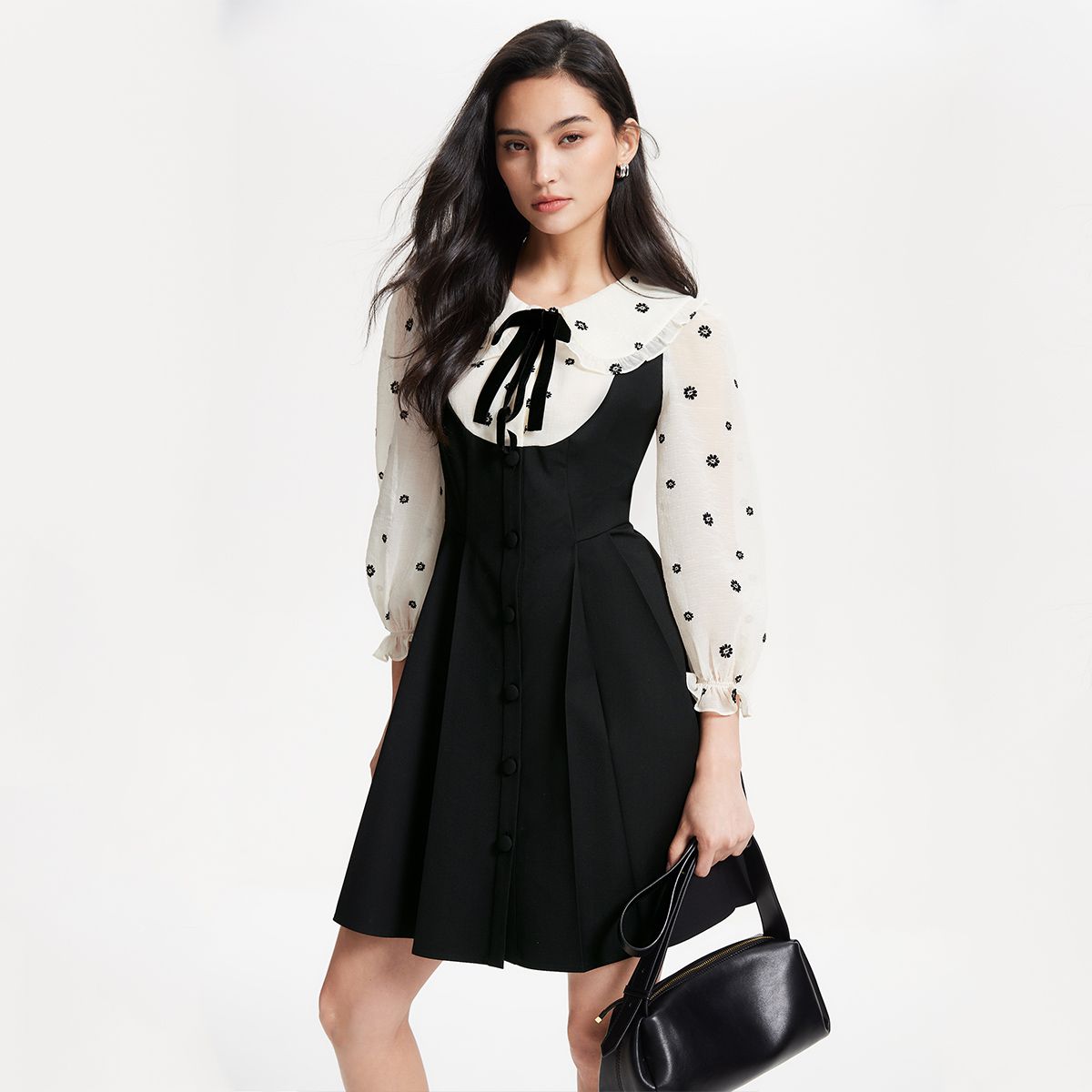 【新派学院】连衣裙法式优雅娃娃翻领花朵可拆装饰小黑裙 335057