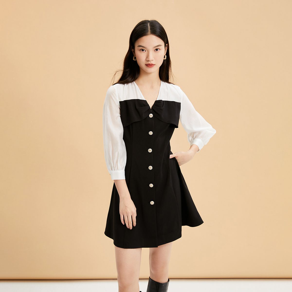 【春夏专柜款】V领七分袖A字裙摆优雅简约连衣裙气质百搭时尚 950225