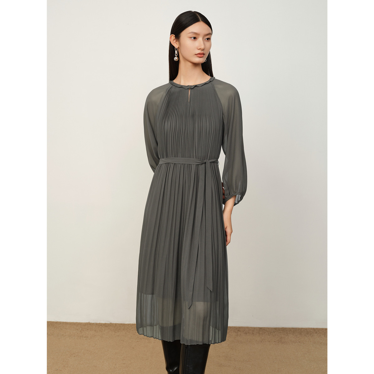 玖姿旗下安娜蔻系列洋气褶皱收腰长款纯色连衣裙女装 645708